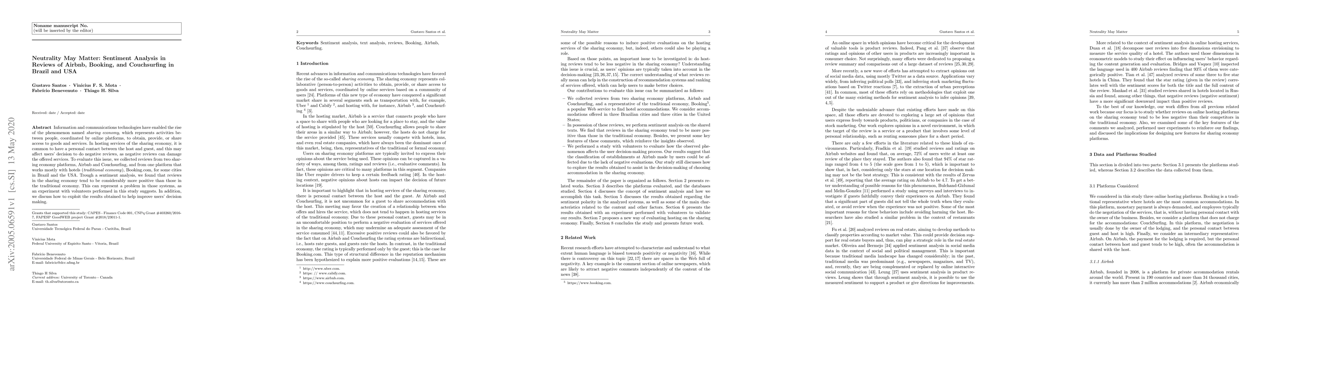 This study analyzes reviews from Airbnb, Couchsurfing, and Booking.com to compare sentiment in sharing economy platforms versus traditional hotel services. The sentiment analysis reveals that sharing economy reviews are more positive, potentially skewing user decisions, as suggested by an experiment with volunteers.