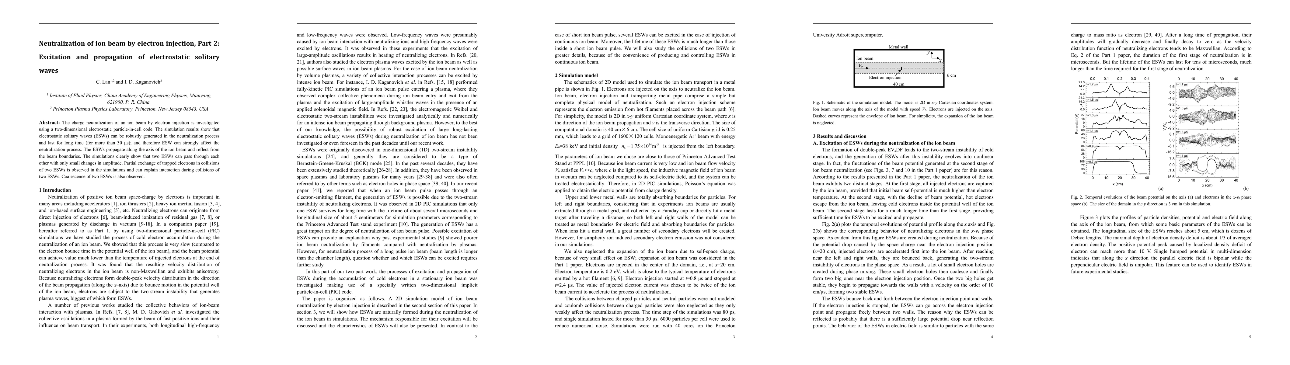 This paper investigates the neutralization of an ion beam via electron injection, revealing the generation and propagation of electrostatic solitary waves (ESWs) that last over 30 microseconds and significantly influence the neutralization process. The study shows that ESWs can reflect from beam boundaries and partially exchange trapped electrons upon collision, demonstrating coalescence behavior.