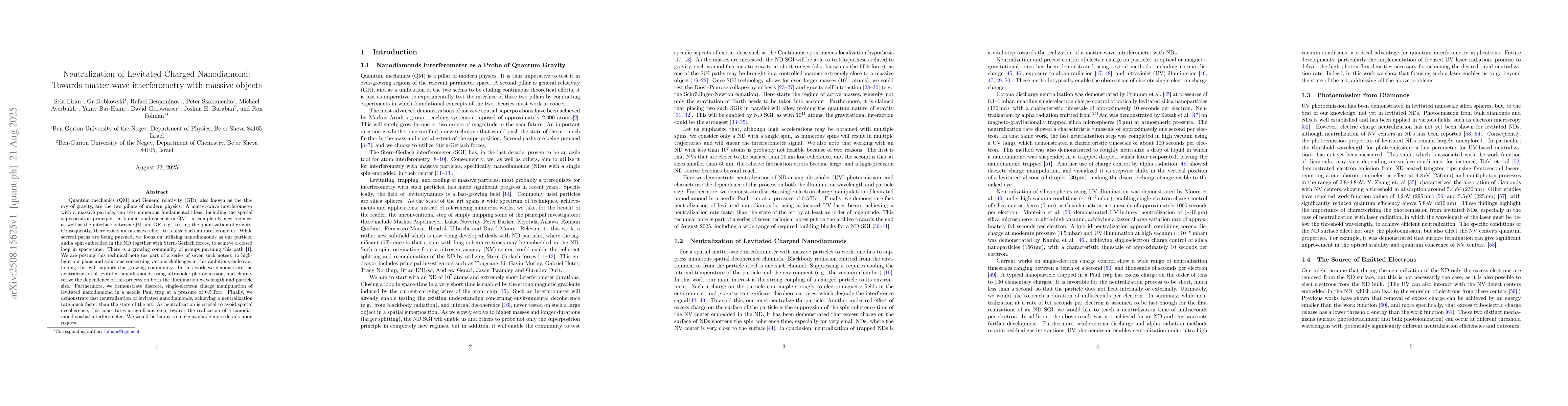 Quantum mechanics (QM) and General relativity (GR), also known as the theory of gravity, are the two pillars of modern physics. A matter-wave interferometer with a massive particle, can test numerous fundamental ideas, including the spatial superposition principle - a foundational concept in QM - in completely new regimes, as well as the interface between QM and GR, e.g., testing the quantization of gravity. Consequently, there exists an intensive effort to realize such an interferometer. While several paths are being pursued, we focus on utilizing nanodiamonds as our particle, and a spin embedded in the ND together with Stern-Gerlach forces, to achieve a closed loop in space-time. There is a growing community of groups pursuing this path [1]. We are posting this technical note (as part of a series of seven such notes), to highlight our plans and solutions concerning various challenges in this ambitious endeavor, hoping this will support this growing community. In this work we demonstrate the neutralization of levitated nanodiamonds using ultraviolet photoemission, and characterize the dependence of this process on both the illumination wavelength and particle size. Furthermore, we demonstrate discrete, single-electron charge manipulation of levitated nanodiamond in a needle Paul trap at a pressure of 0.5\,Torr. Finally, we demonstrate fast neutralization of levitated nanodiamonds, achieving a neutralization rate much faster than the state of the art. As neutralization is crucial to avoid spatial decoherence, this constitutes a significant step towards the realization of a nanodiamond spatial interferometer. We would be happy to make available more details upon request.