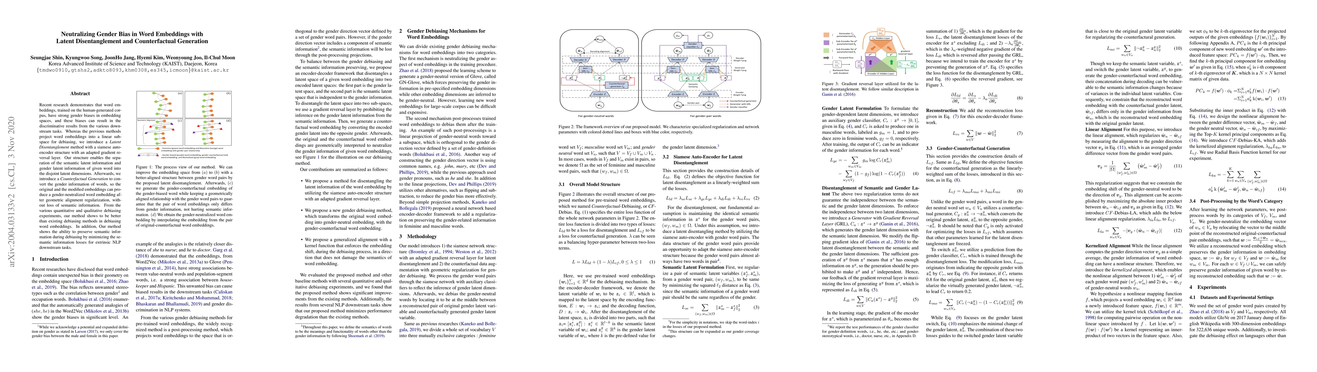 This paper proposes a novel method for neutralizing gender bias in word embeddings using latent disentanglement and counterfactual generation. The method separates semantic and gender information in word embeddings and generates counterfactuals to neutralize gender biases while preserving semantic information.