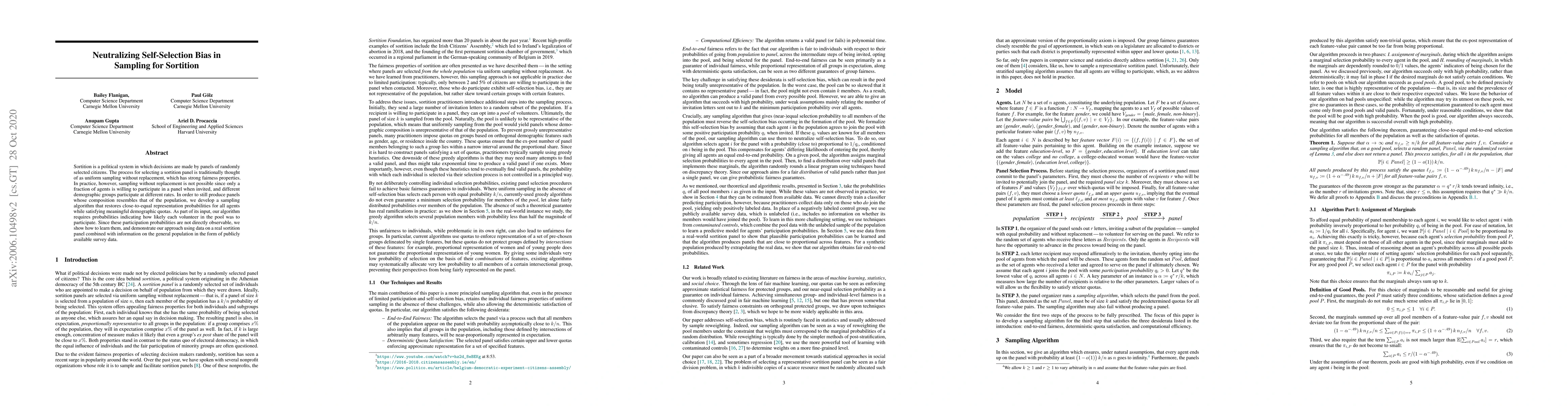 This paper proposes a sampling algorithm to mitigate self-selection bias in sortition panels, ensuring demographic quotas while restoring near-equal representation probabilities for all participants. It also outlines a method for inferring participation probabilities when direct data is unavailable, validated through real-world sortition panel data and public survey information.