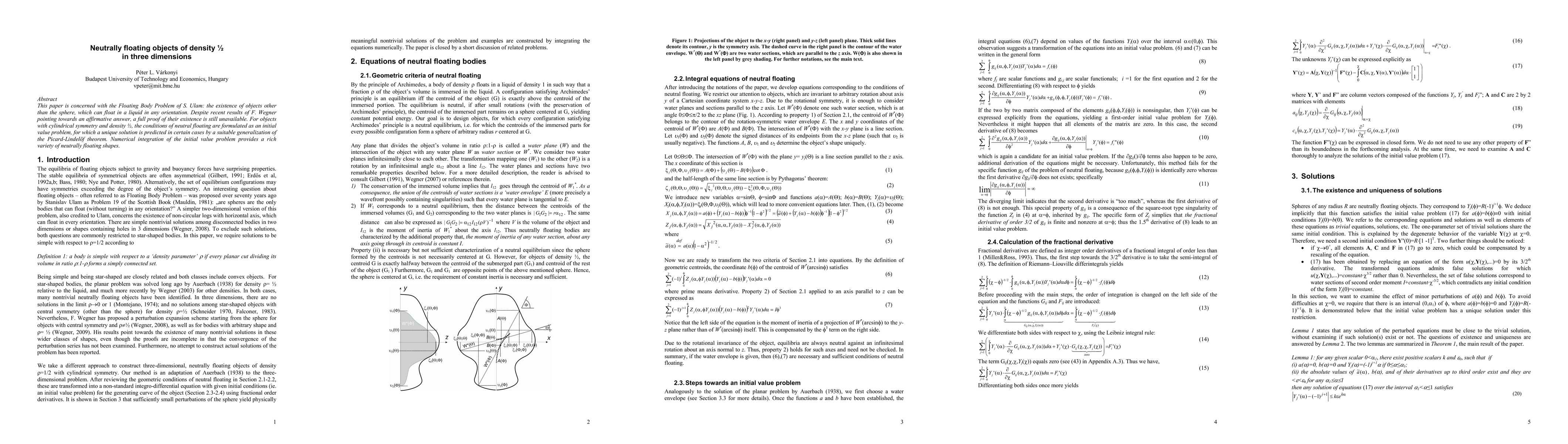 This paper explores the Floating Body Problem, investigating the existence of non-spherical objects with density 1/2 that can float neutrally in any orientation. It formulates the conditions for neutral floating as an initial value problem, predicting unique solutions in certain cases using a generalized Picard-Lindel\"of theorem, and demonstrates a variety of floating shapes through numerical integration.