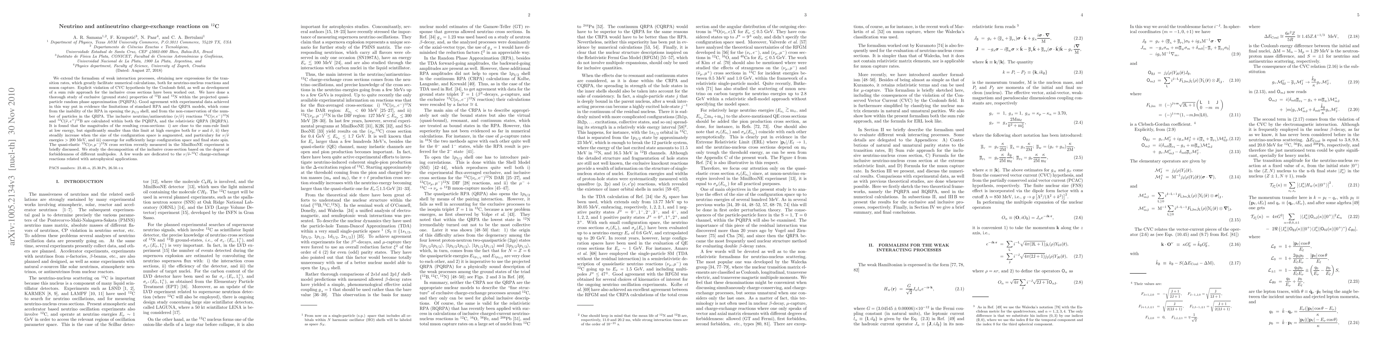 We extend the formalism of weak interaction processes, obtaining new expressions for the transition rates, which greatly facilitate numerical calculations, both for neutrino-nucleus reactions and muon capture. Explicit violation of CVC hypothesis by the Coulomb field, as well as development of a sum rule approach for the inclusive cross sections have been worked out. We have done a thorough study of exclusive (ground state) properties of $^{12}$B and $^{12}$N within the projected quasiparticle random phase approximation (PQRPA). Good agreement with experimental data achieved in this way put in evidence the limitations of standard RPA and the QRPA models, which come from the inability of the RPA in opening the $p_{3/2}$ shell, and from the non-conservation of the number of particles in the QRPA. The inclusive neutrino/antineutrino ($\nu/\tilde{\nu}$) reactions $^{12}$C($\nu,e^-)^{12}$N and $^{12}$C($\tilde{\nu},e^+)^{12}$B are calculated within both the PQRPA, and the relativistic QRPA (RQRPA). It is found that the magnitudes of the resulting cross-sections: i) are close to the sum-rule limit at low energy, but significantly smaller than this limit at high energies both for $\nu$ and $\tilde{\nu}$, ii) they steadily increase when the size of the configuration space is augmented, and particulary for $\nu/\tilde{\nu}$ energies $> 200$ MeV, and iii) converge for sufficiently large configuration space and final state spin. The quasi-elastic $^{12}$C($\nu,\mu^-)^{12}$N cross section recently measured in the MiniBooNE experiment is briefly discussed. We study the decomposition of the inclusive cross-section based on the degree of forbiddenness of different multipoles. A few words are dedicated to the $\nu/\tilde{\nu}$-$^{12}$C charge-exchange reactions related with astrophysical applications.
