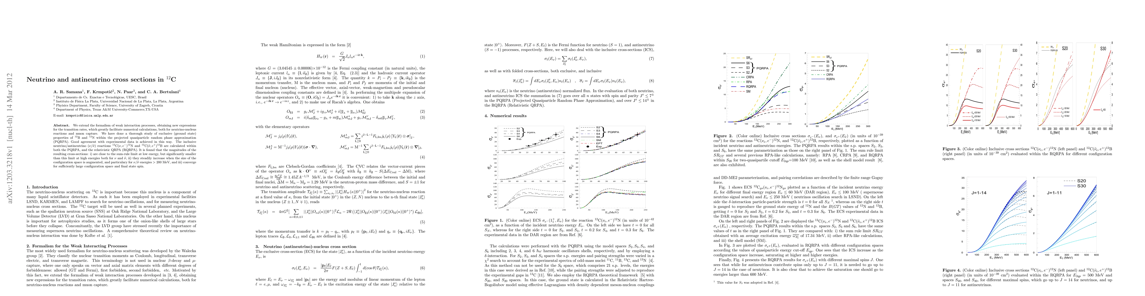 We extend the formalism of weak interaction processes, obtaining new expressions for the transition rates, which greatly facilitate numerical calculations, both for neutrino-nucleus reactions and muon capture. We have done a thorough study of exclusive (ground state) properties of $^{12}$B and $^{12}$N within the projected quasiparticle random phase approximation (PQRPA). Good agreement with experimental data is achieved in this way. The inclusive neutrino/antineutrino ($\nu/\tilde{\nu}$) reactions $^{12}$C($\nu,e^-)^{12}$N and $^{12}$C($\tilde{\nu},e^+)^{12}$B are calculated within both the PQRPA, and the relativistic QRPA (RQRPA). It is found that the magnitudes of the resulting cross-sections: i) are close to the sum-rule limit at low energy, but significantly smaller than this limit at high energies both for $\nu$ and $\tilde{\nu}$, ii) they steadily increase when the size of the configuration space is augmented, and particulary for $\nu/\tilde{\nu}$ energies $> 200$ MeV, and iii) converge for sufficiently large configuration space and final state spin.