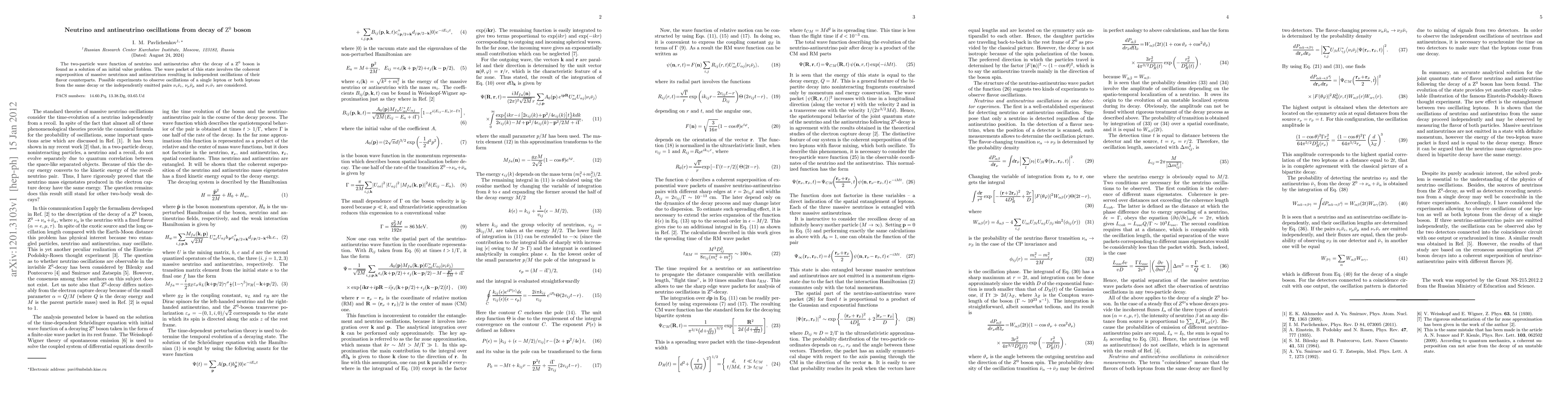 The two-particle wave function of neutrino and antineutrino after the decay of a Z boson is found as a solution of an initial value problem. The wave packet of this state involves the coherent superposition of massive neutrinos and antineutrinos resulting in independent oscillations of their flavor counterparts. Possible experiments to observe oscillations of a single lepton or both leptons from the same decay and the three independently emitted pairs are considered.