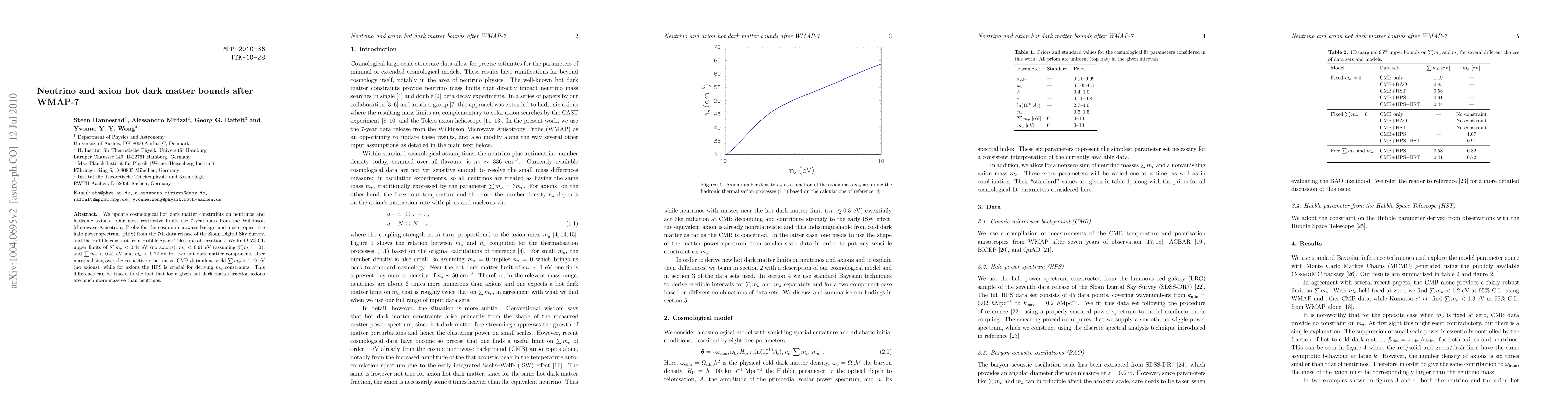 Researchers updated limits on neutrinos and axions as dark matter components using 7-year data from the Wilkinson Microwave Anisotropy Probe and other sources, finding constraints of up to 1.19 eV for neutrinos alone.