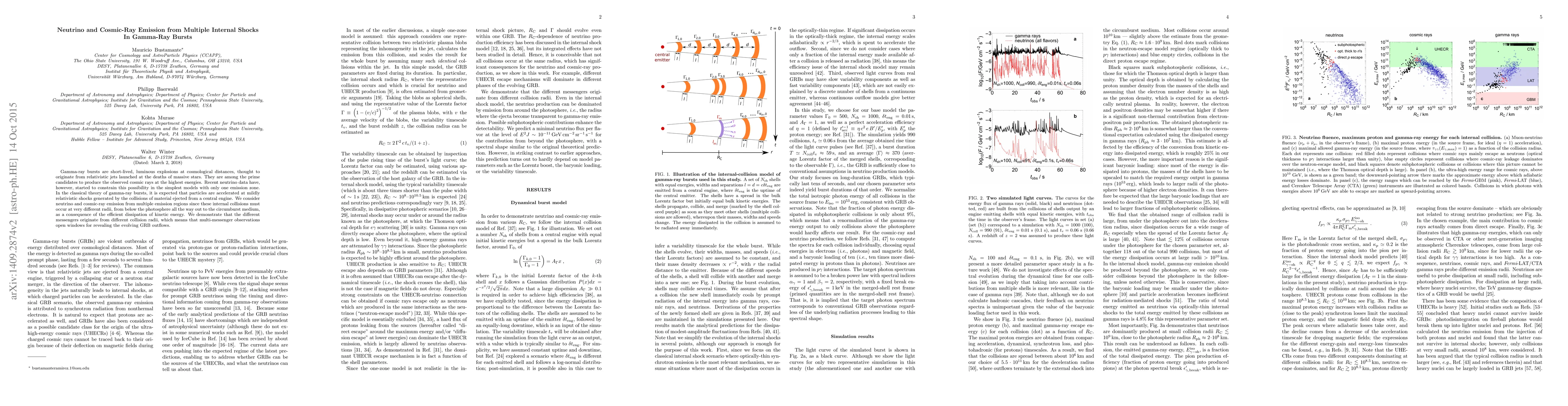 This paper investigates neutrino and cosmic-ray emissions from multiple internal shocks within gamma-ray bursts, suggesting that different messengers originate from varying collision radii. Such multi-messenger observations can provide insights into the evolving outflows of these bursts.