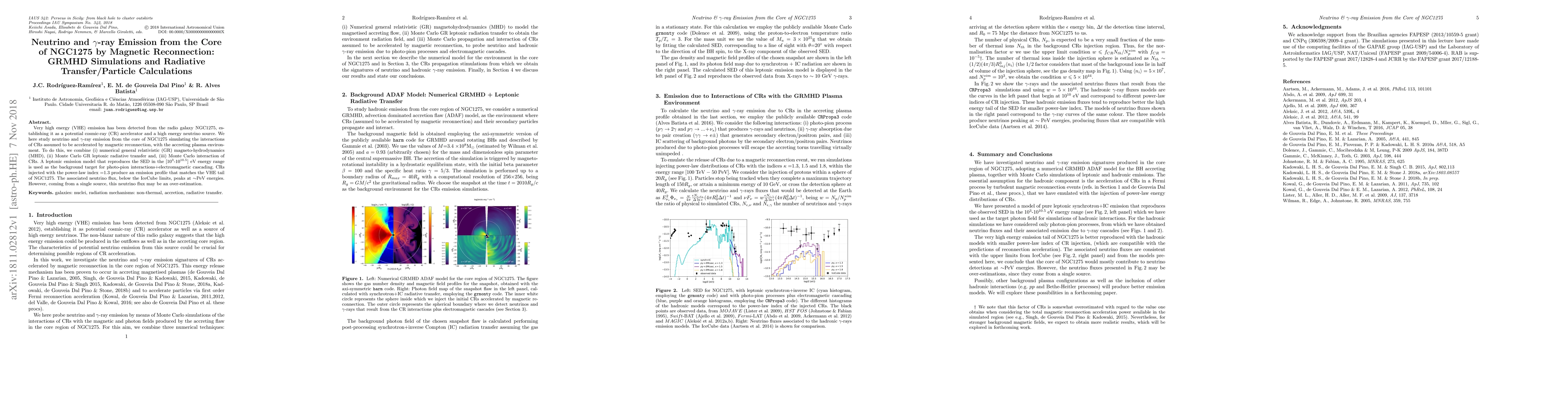 This study combines GRMHD simulations with radiative transfer and particle calculations to model neutrino and gamma-ray emissions from NGC1275's core, attributing these emissions to cosmic rays accelerated by magnetic reconnection. The results suggest a potential match to observed VHE emissions, but the predicted neutrino flux may be overestimated for a single source.