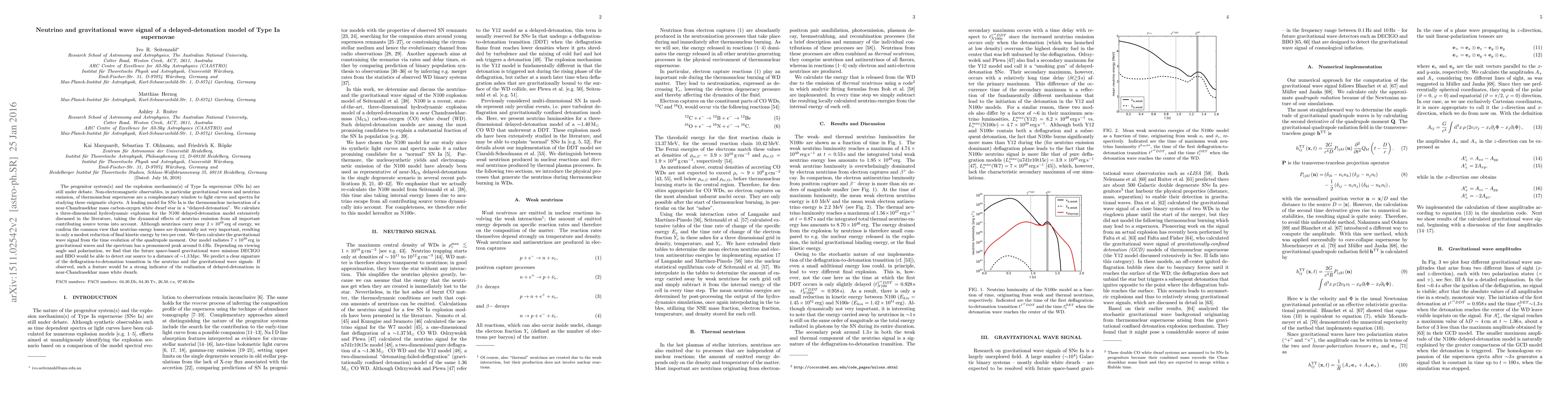 The progenitor system(s) and the explosion mechanism(s) of Type Ia supernovae (SNe Ia) are still under debate. Non-electromagnetic observables, in particular gravitational waves and neutrino emission, of thermonuclear supernovae are a complementary window to light curves and spectra for studying these enigmatic objects. A leading model for SNe Ia is the thermonuclear incineration of a near-Chandrasekhar mass carbon-oxygen white dwarf star in a "delayed-detonation". We calculate a three-dimensional hydrodynamic explosion for the N100 delayed-detonation model extensively discussed in the literature, taking the dynamical effects of neutrino emission from all important contributing source terms into account. Although neutrinos carry away $2 \times 10^{49}$ erg of energy, we confirm the common view that neutrino energy losses are dynamically not very important, resulting in only a modest reduction of the final kinetic energy by two per cent. We then calculate the gravitational wave signal from the time evolution of the quadrupole moment. Our model radiates $7 \times 10^{39}$ erg in gravitational waves and the spectrum has a pronounced peak around 0.4 Hz. Depending on viewing angle and polarization, we find that the future space-based gravitational wave missions DECIGO and BBO would be able to detect our source to a distance of 1.3 Mpc. We predict a clear signature of the deflagration-to-detonation transition in the neutrino and the gravitational wave signals. If observed, such a feature would be a strong indicator of the realization of delayed-detonations in near-Chandrasekhar mass white dwarfs.