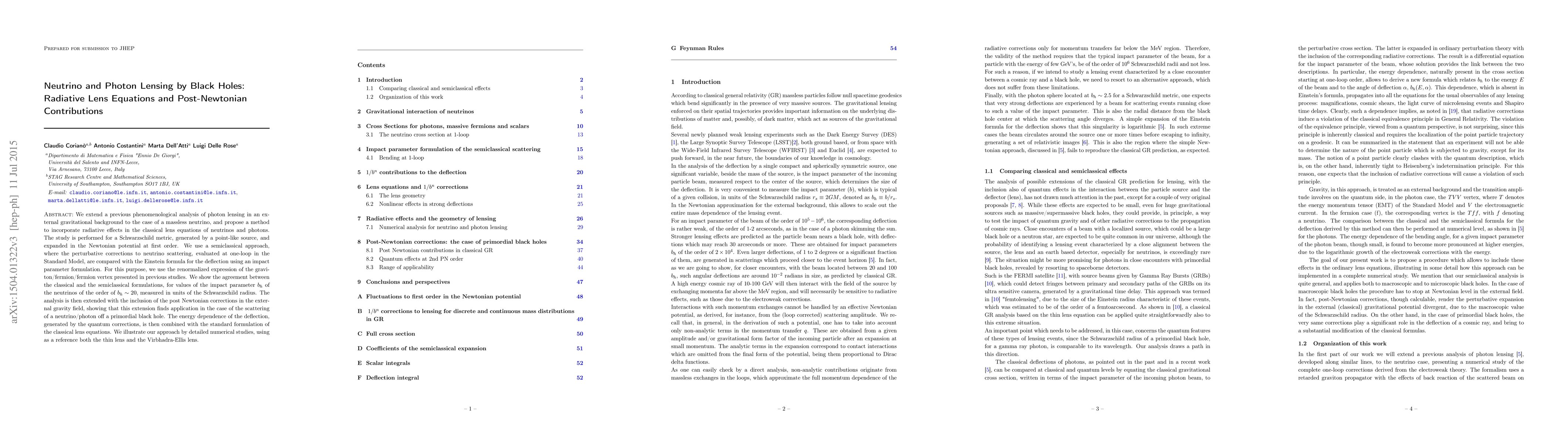 We extend a previous phenomenological analysis of photon lensing in an external gravitational background to the case of a massless neutrino, and propose a method to incorporate radiative effects in the classical lens equations of neutrinos and photons. The study is performed for a Schwarzschild metric, generated by a point-like source, and expanded in the Newtonian potential at first order. We use a semiclassical approach, where the perturbative corrections to neutrino scattering, evaluated at one-loop in the Standard Model, are compared with the Einstein formula for the deflection using an impact parameter formulation. For this purpose, we use the renormalized expression of the graviton/fermion/fermion vertex presented in previous studies. We show the agreement between the classical and the semiclassical formulations, for values of the impact parameter $b_h$ of the neutrinos of the order of $b_h\sim 20$, measured in units of the Schwarzschild radius. The analysis is then extended with the inclusion of the post Newtonian corrections in the external gravity field, showing that this extension finds application in the case of the scattering of a neutrino/photon off a primordial black hole. The energy dependence of the deflection, generated by the quantum corrections, is then combined with the standard formulation of the classical lens equations. We illustrate our approach by detailed numerical studies, using as a reference both the thin lens and the nonlinear Virbhadra-Ellis lens.