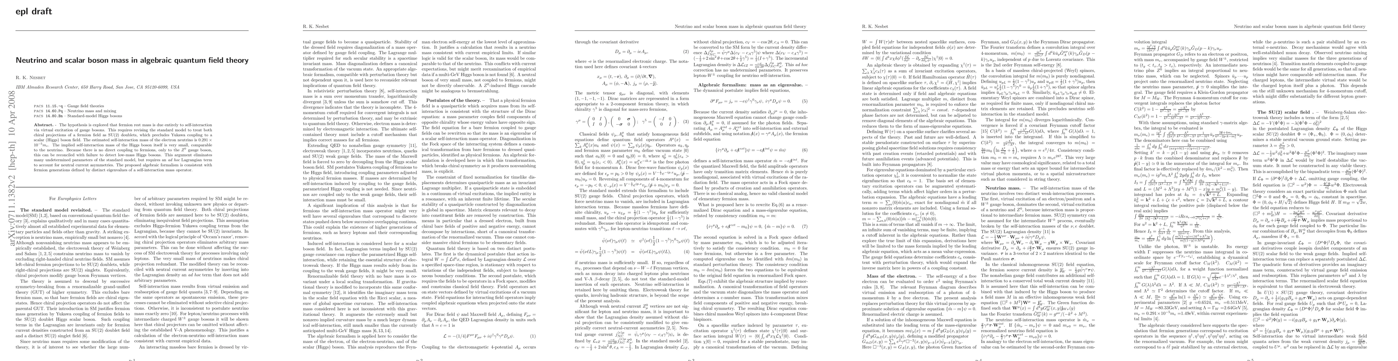 The hypothesis is explored that fermion rest mass is due entirely to self-interaction via virtual excitation of gauge bosons. This requires revising the standard model to treat both chiral projections of a fermion field as SU(2) doublets, which precludes Yukawa coupling to a scalar (Higgs) boson field. The estimated self-interaction mass of the electron neutrino is $0.291\times10^{-5}m_e$. The implied self-interaction mass of the Higgs boson itself is very small, comparable to the neutrino. Because there is no direct coupling to fermions, only to the $Z^0$ gauge boson, this can be reconciled with failure to detect low-mass Higgs bosons. This argument eliminates many undetermined parameters of the standard model, but requires an {\it ad hoc} Lagrangian term to account for neutral current asymmetries. The proposed algebraic formalism is consistent with fermion generations defined by distinct eigenvalues of a self-interaction mass operator.