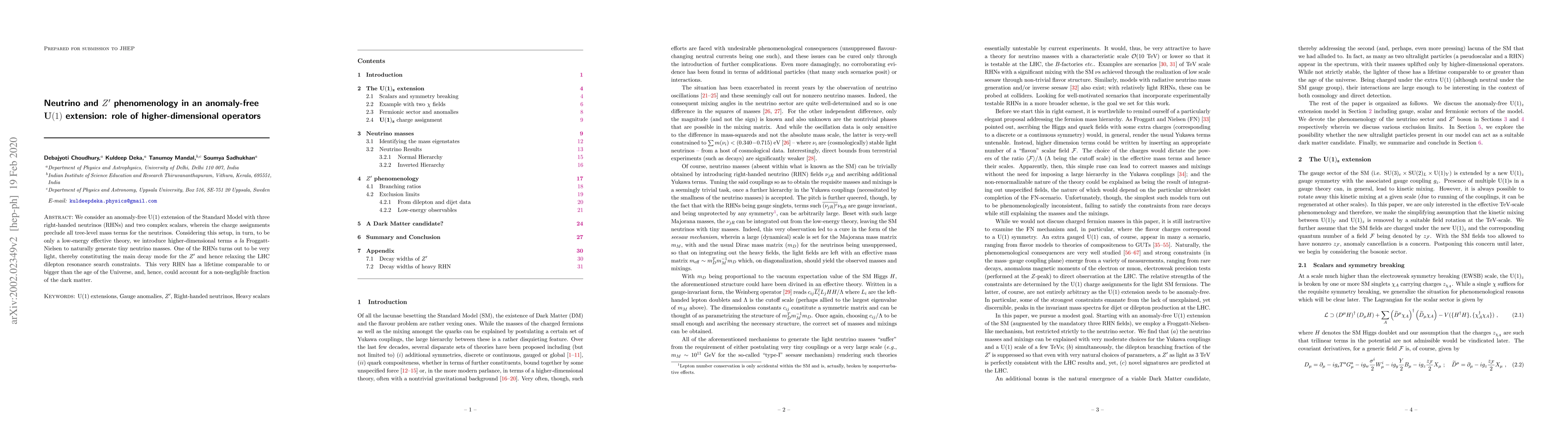 We consider an anomaly-free $\mathrm{U}(1)$ extension of the Standard Model with three right-handed neutrinos (RHNs) and two complex scalars, wherein the charge assignments preclude all tree-level mass terms for the neutrinos. Considering this setup, in turn, to be only a low-energy effective theory, we introduce higher-dimensional terms {\em a la} Froggatt-Nielsen to naturally generate tiny neutrino masses. One of the RHNs turns out to be very light, thereby constituting the main decay mode for the $Z'$ and hence relaxing the LHC dilepton resonance search constraints. This very RHN has a lifetime comparable to or bigger than the age of the Universe, and, hence, could account for a non-negligible fraction of the dark matter.