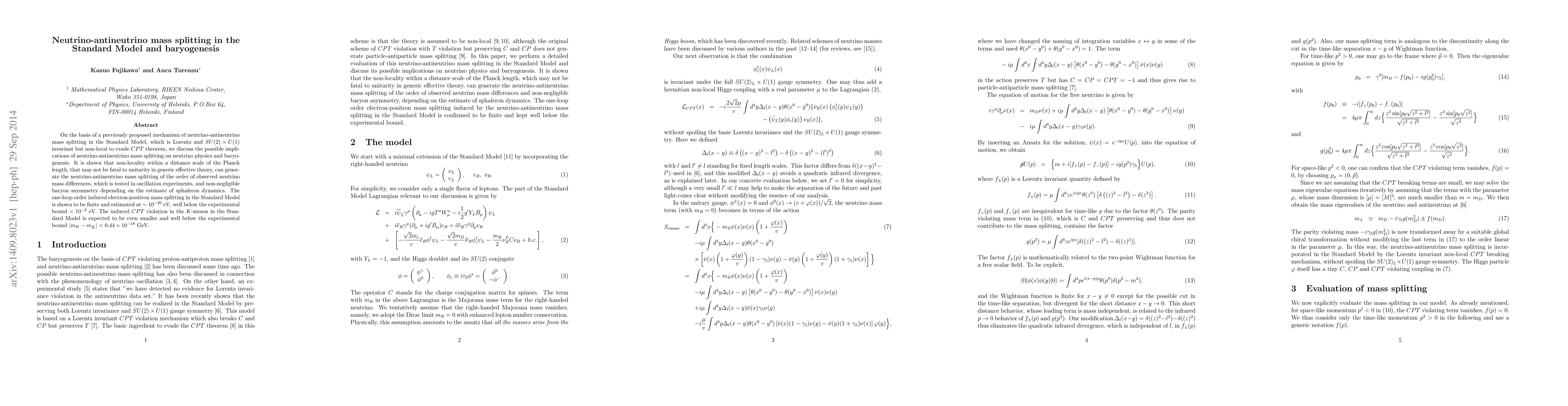 This paper explores the implications of a proposed non-local mechanism for neutrino-antineutrino mass splitting within the Standard Model, demonstrating its potential to generate observed neutrino mass differences and a non-negligible baryon asymmetry. The study also shows that this mechanism induces negligible electron-positron and $K$-meson mass splittings, remaining below experimental bounds.