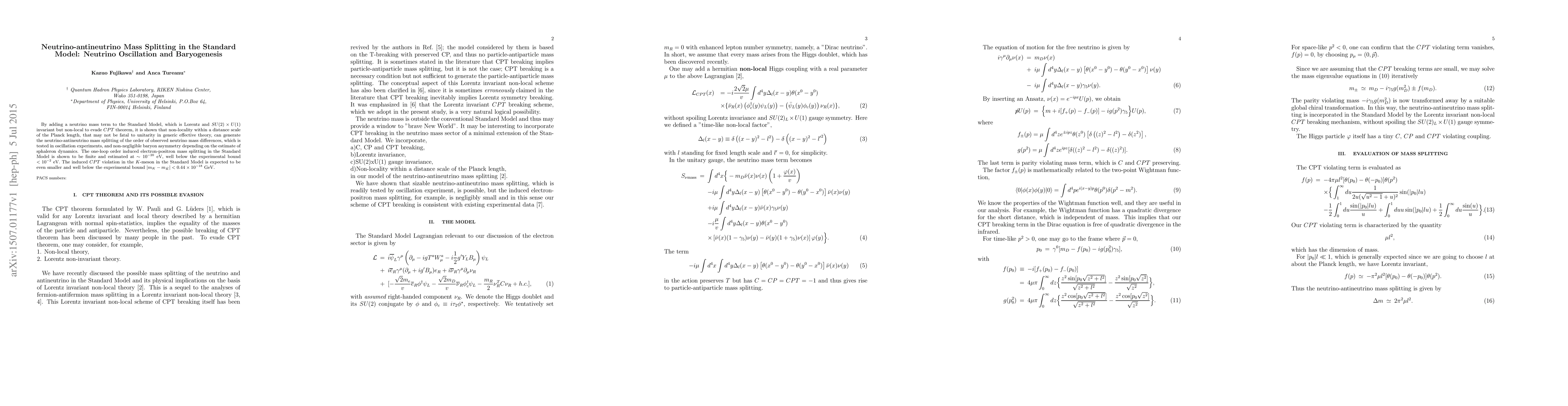 This paper explores a non-local extension of the Standard Model to generate neutrino-antineutrino mass splitting, consistent with observed mass differences and oscillation experiments. It also predicts a negligible baryon asymmetry and minimal $CPT$ violation, both well below experimental detection limits.