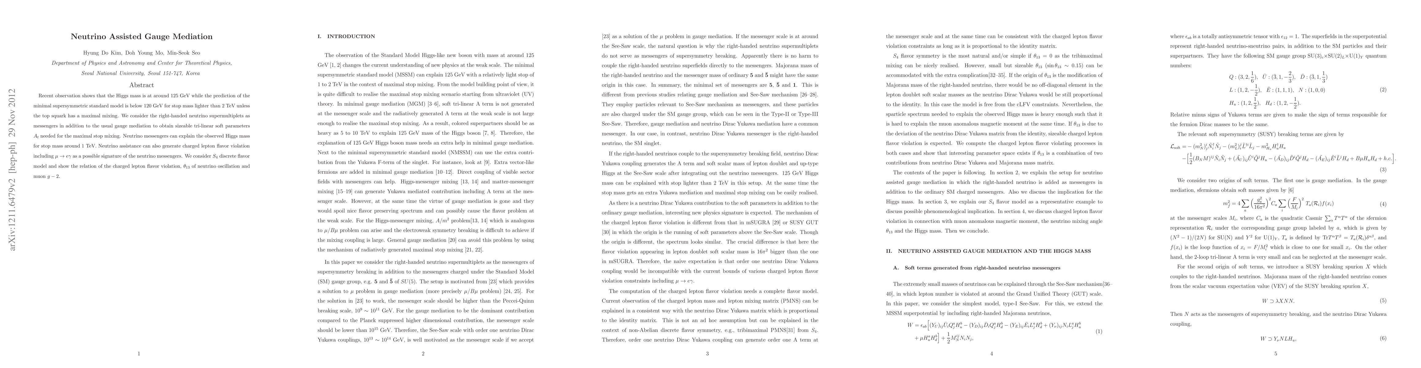 Recent observation shows that the Higgs mass is at around 125 GeV while the prediction of the minimal supersymmetric standard model is below 120 GeV for stop mass lighter than 2 TeV unless the top squark has a maximal mixing. We consider the right-handed neutrino supermultiplets as messengers in addition to the usual gauge mediation to obtain sizeable tri-linear soft parameters $A_t$ needed for the maximal stop mixing. Neutrino messengers can explain the observed Higgs mass for stop mass around 1 TeV. Neutrino assistance can also generate charged lepton flavor violation including $\mu \to e \gamma$ as a possible signature of the neutrino messengers. We consider $S_4$ discrete flavor model and show the relation of the charged lepton flavor violation, $\theta_{13}$ of neutrino oscillation and muon $g-2$.