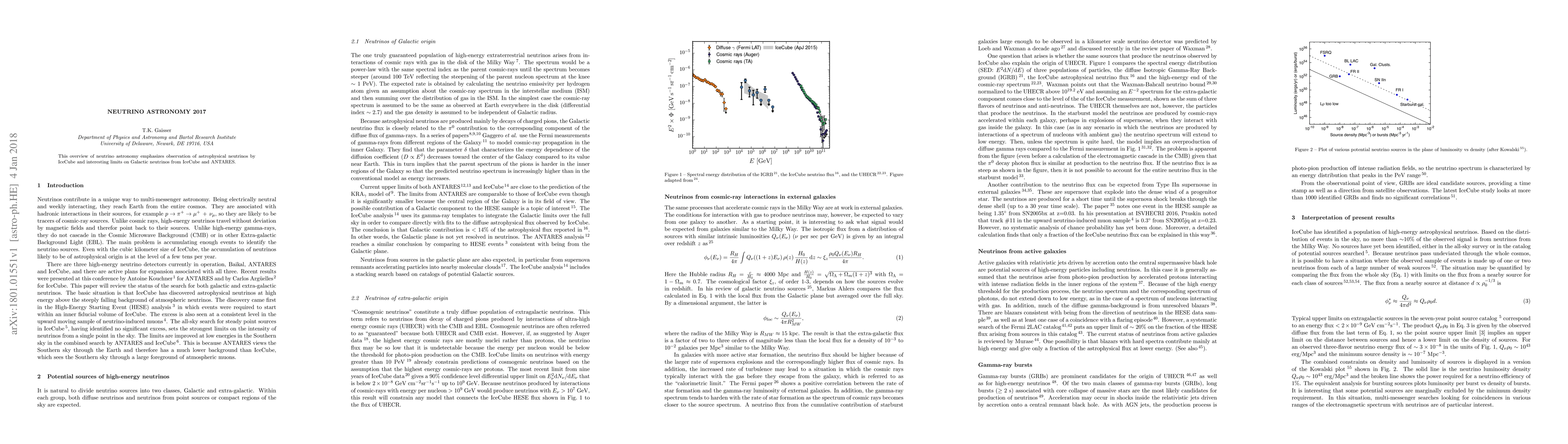 Summary: This paper provides an overview of neutrino astronomy, focusing on observations made by IceCube and ANTARES, highlighting significant limits on Galactic neutrinos and the potential for future discoveries.