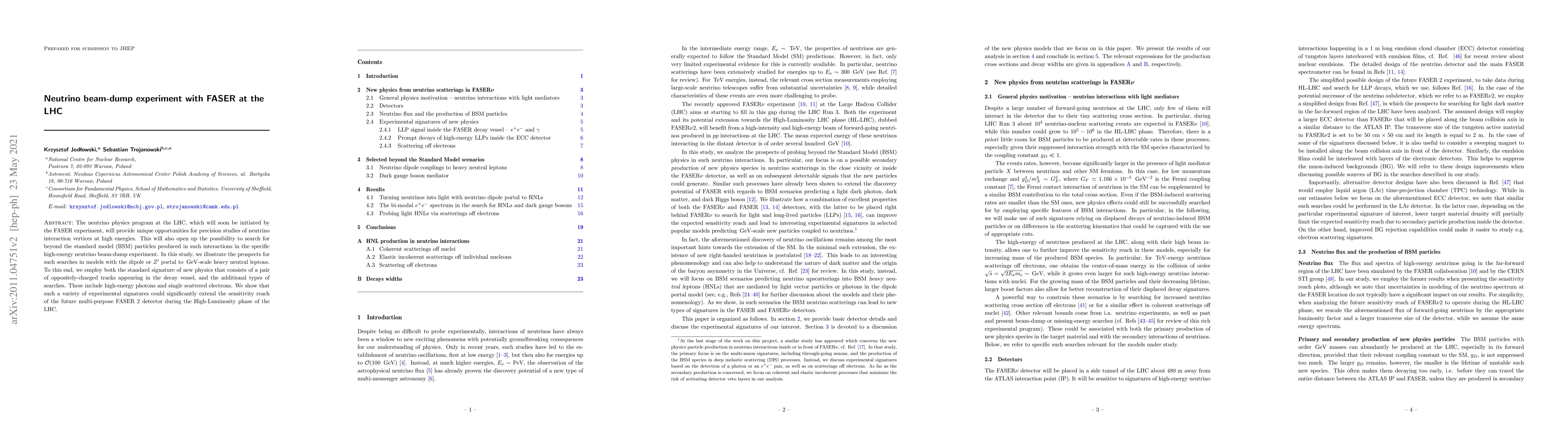 The neutrino physics program at the LHC, which will soon be initiated by the FASER experiment, will provide unique opportunities for precision studies of neutrino interaction vertices at high energies. This will also open up the possibility to search for beyond the standard model (BSM) particles produced in such interactions in the specific high-energy neutrino beam-dump experiment. In this study, we illustrate the prospects for such searches in models with the dipole or $Z^\prime$ portal to GeV-scale heavy neutral leptons. To this end, we employ both the standard signature of new physics that consists of a pair of oppositely-charged tracks appearing in the decay vessel, and the additional types of searches. These include high-energy photons and single scattered electrons. We show that such a variety of experimental signatures could significantly extend the sensitivity reach of the future multi-purpose FASER 2 detector during the High-Luminosity phase of the LHC.