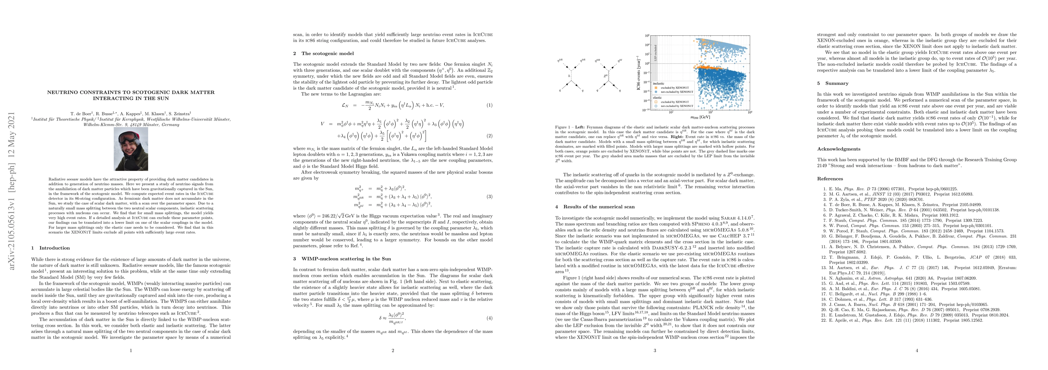 This paper explores neutrino signals from the annihilation of scotogenic dark matter captured in the Sun, focusing on scalar dark matter scenarios. It finds high event rates in the IceCube detector for small mass splittings, which could set a lower limit on scalar couplings if excluded. For larger mass splittings, XENON1T limits rule out high event rates.