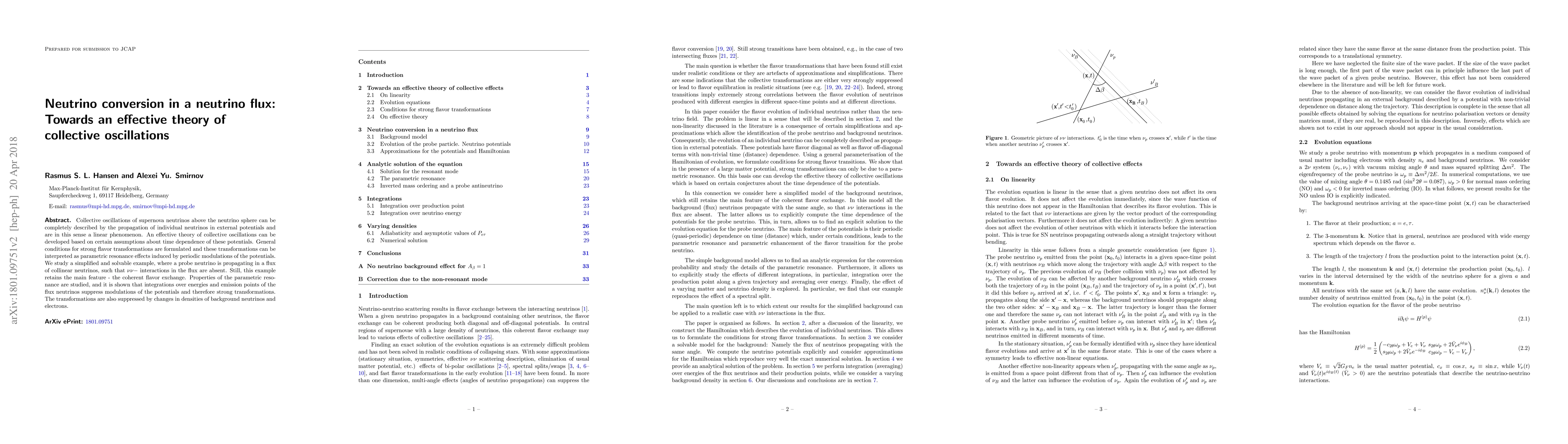 Collective oscillations of supernova neutrinos above the neutrino sphere can be completely described by the propagation of individual neutrinos in external potentials and are in this sense a linear phenomenon. An effective theory of collective oscillations can be developed based on certain assumptions about time dependence of these potentials. General conditions for strong flavor transformations are formulated and these transformations can be interpreted as parametric resonance effects induced by periodic modulations of the potentials. We study a simplified and solvable example, where a probe neutrino is propagating in a flux of collinear neutrinos, such that $\nu \nu-$ interactions in the flux are absent. Still, this example retains the main feature - the coherent flavor exchange. Properties of the parametric resonance are studied, and it is shown that integrations over energies and emission points of the flux neutrinos suppress modulations of the potentials and therefore strong transformations. The transformations are also suppressed by changes in densities of background neutrinos and electrons.