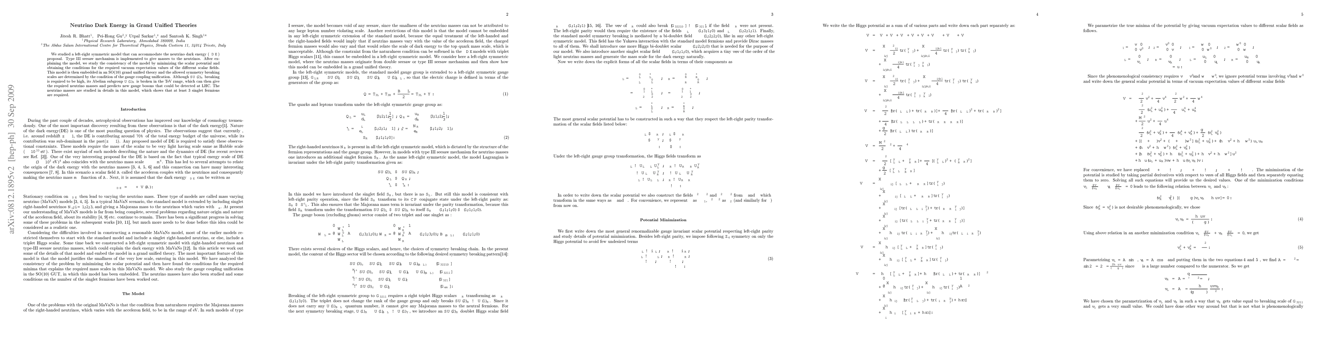 We studied a left-right symmetric model that can accommodate the neutrino dark energy (\nd) proposal. Type III seesaw mechanism is implemented to give masses to the neutrinos. After explaining the model, we study the consistency of the model by minimizing the scalar potential and obtaining the conditions for the required vacuum expectation values of the different scalar fields. This model is then embedded in an SO(10) grand unified theory and the allowed symmetry breaking scales are determined by the condition of the gauge coupling unification. Although $SU(2)_{R}$ breaking is required to be high, its Abelian subgroup $U(1)_{R}$ is broken in the TeV range, which can then give the required neutrino masses and predicts new gauge bosons that could be detected at LHC. The neutrino masses are studied in details in this model, which shows that at least 3 singlet fermions are required.