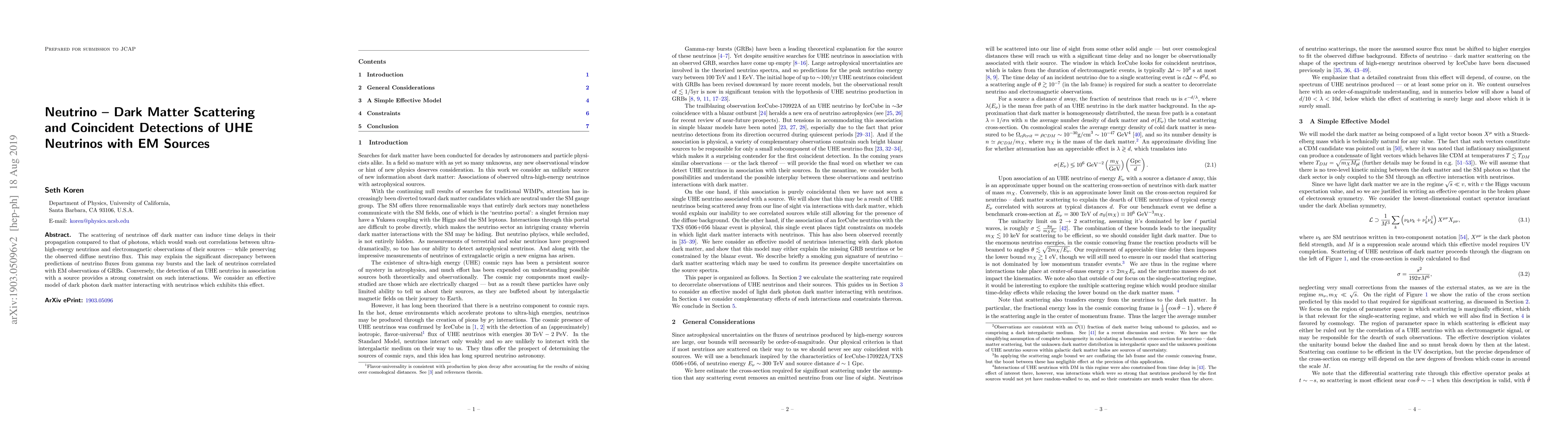 The scattering of neutrinos off dark matter can induce time delays in their propagation compared to that of photons, which would wash out correlations between ultra-high-energy neutrinos and electromagnetic observations of their sources - while preserving the observed diffuse neutrino flux. This may explain the significant discrepancy between predictions of neutrino fluxes from gamma ray bursts and the lack of neutrinos correlated with EM observations of GRBs. Conversely, the detection of an UHE neutrino in association with a source provides a strong constraint on such interactions. We consider an effective model of dark photon dark matter interacting with neutrinos which exhibits this effect.