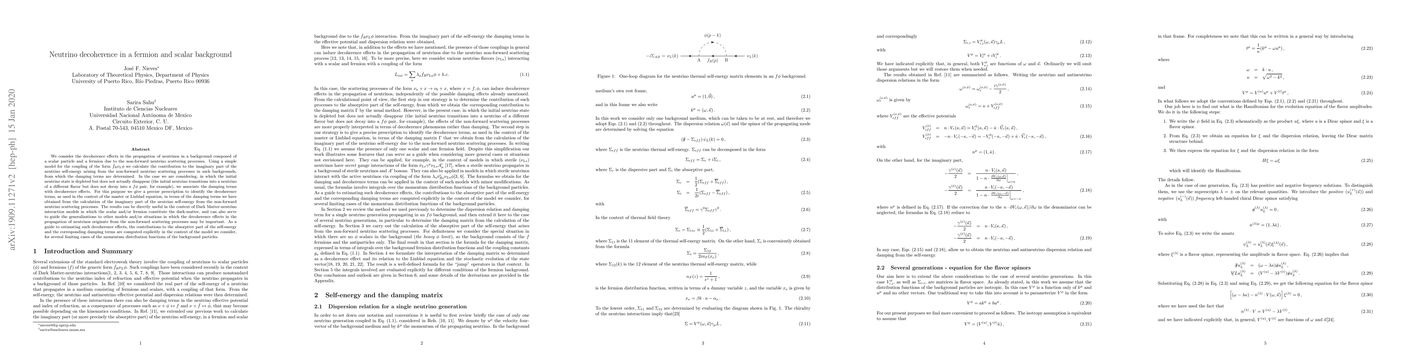 Researchers studied how neutrinos interact with a background of particles (fermion and scalar) in space, finding that these interactions can cause the neutrinos to lose their coherence and energy over time.