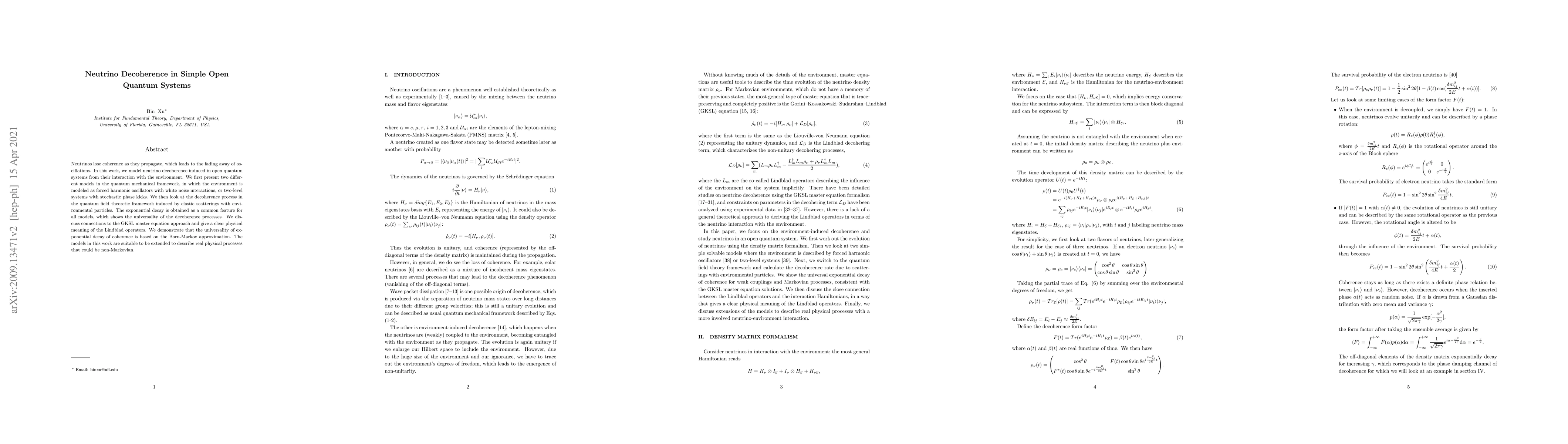 The research models neutrino decoherence in open quantum systems using two distinct models: forced harmonic oscillators with white noise interactions and two-level systems with stochastic phase kicks. The decoherence process is also examined in the quantum field theoretical framework through elastic scatterings with environmental particles.