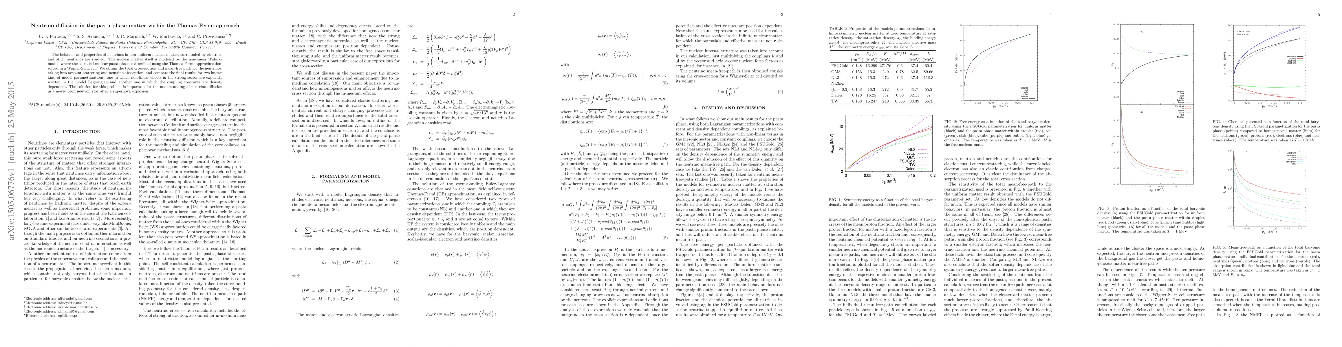 This paper investigates neutrino behavior in the nuclear pasta phase using the Thomas-Fermi approach within the non-linear Walecka model, calculating the total cross-section and mean-free path for neutrino interactions. It compares results from two model parametrizations, which is crucial for understanding neutrino diffusion in neutron stars post-supernova.