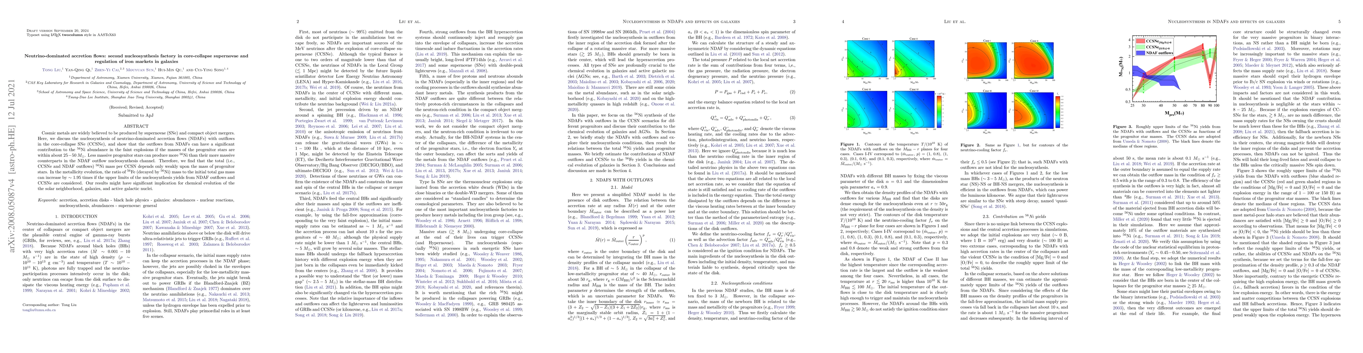 This paper explores the nucleosynthesis in neutrino-dominated accretion flows (NDAFs) during core-collapse supernovae (CCSNe), revealing that NDAF outflows significantly contribute to $^{56}$Ni production in faint explosions from progenitor stars of $25-50$ $M_\odot$. It concludes that NDAFs can regulate the iron market in galaxies, potentially increasing the $^{56}$Fe mass by 1.95 times, impacting the chemical evolution of galaxies and active galactic nuclei.