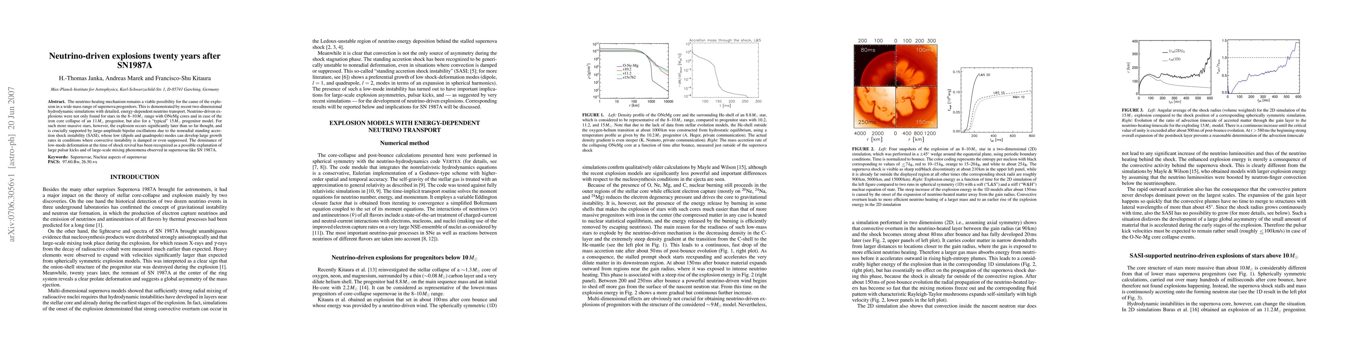 The neutrino-heating mechanism remains a viable possibility for the cause of the explosion in a wide mass range of supernova progenitors. This is demonstrated by recent two-dimensional hydrodynamic simulations with detailed, energy-dependent neutrino transport. Neutrino-driven explosions were not only found for stars in the range of 8-10 solar masses with ONeMg cores and in case of the iron core collapse of a progenitor with 11 solar masses, but also for a ``typical'' progenitor model of 15 solar masses. For such more massive stars, however, the explosion occurs significantly later than so far thought, and is crucially supported by large-amplitude bipolar oscillations due to the nonradial standing accretion shock instability (SASI), whose low (dipole and quadrupole) modes can develop large growth rates in conditions where convective instability is damped or even suppressed. The dominance of low-mode deformation at the time of shock revival has been recognized as a possible explanation of large pulsar kicks and of large-scale mixing phenomena observed in supernovae like SN 1987A.