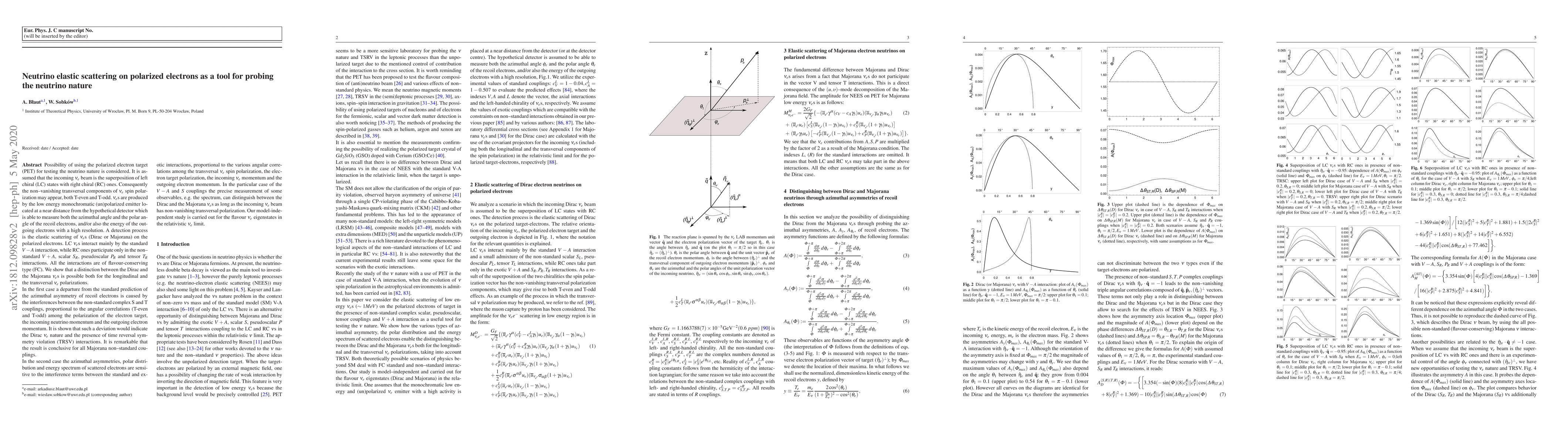 This paper explores the use of polarized electron targets to test the nature of electron neutrinos (νe) through elastic scattering. It demonstrates that distinguishing between Dirac and Majorana neutrinos is possible via measurements of azimuthal asymmetries, polar distributions, and energy spectra of recoil electrons, revealing the presence of non-standard interactions and potential violations of time-reversal symmetry.
