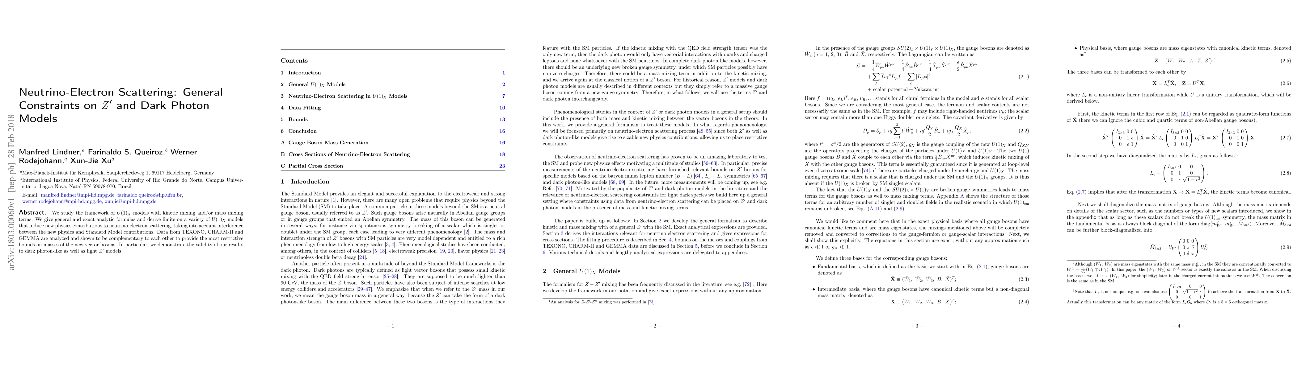 We study the framework of $U(1)_X$ models with kinetic mixing and/or mass mixing terms. We give general and exact analytic formulas and derive limits on a variety of $U(1)_X$ models that induce new physics contributions to neutrino-electron scattering, taking into account interference between the new physics and Standard Model contributions. Data from TEXONO, CHARM-II and GEMMA are analyzed and shown to be complementary to each other to provide the most restrictive bounds on masses of the new vector bosons. In particular, we demonstrate the validity of our results to dark photon-like as well as light $Z^\prime$ models.