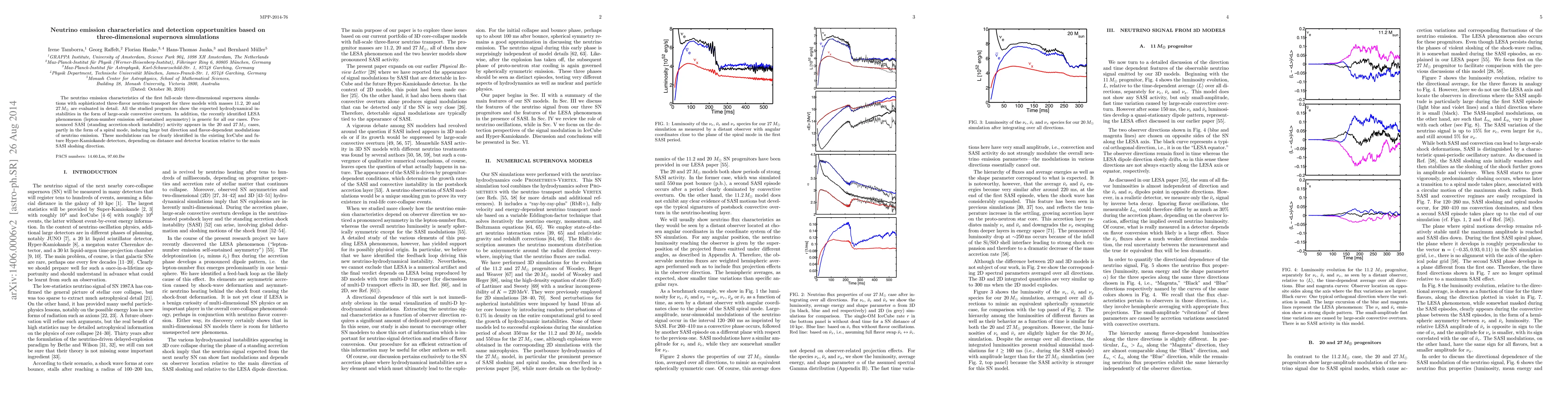 The research employs three-dimensional (3D) supernova simulations with sophisticated three-flavor neutrino transport to analyze neutrino emission characteristics for progenitor masses of 11.2, 20, and 27 solar masses (M_sun).