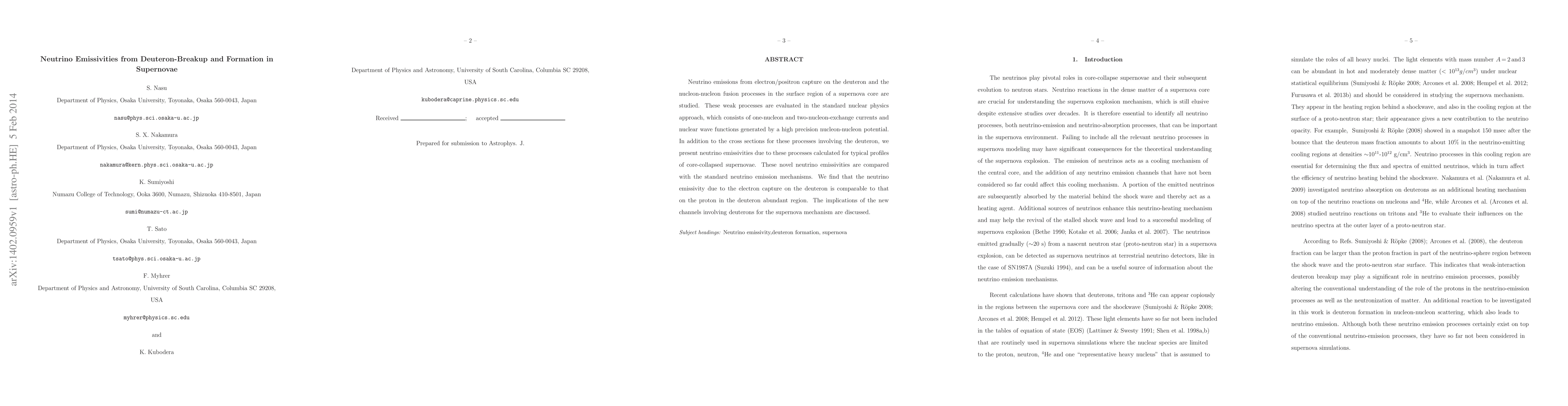 Neutrino emissions from electron/positron capture on the deuteron and the nucleon-nucleon fusion processes in the surface region of a supernova core are studied. These weak processes are evaluated in the standard nuclear physics approach, which consists of one-nucleon and two-nucleon-exchange currents and nuclear wave functions generated by a high precision nucleon-nucleon potential. In addition to the cross sections for these processes involving the deuteron, we present neutrino emissivities due to these processes calculated for typical profiles of core-collapsed supernovae. These novel neutrino emissivities are compared with the standard neutrino emission mechanisms. We find that the neutrino emissivity due to the electron capture on the deuteron is comparable to that on the proton in the deuteron abundant region. The implications of the new channels involving deuterons for the supernova mechanism are discussed.