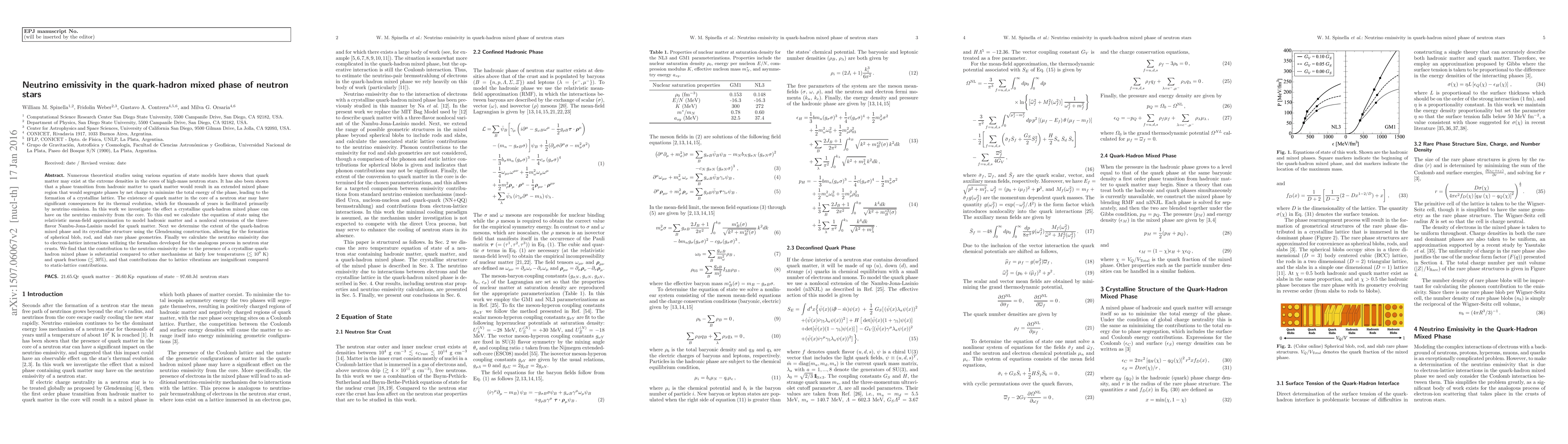 This paper investigates the neutrino emissivity in the quark-hadron mixed phase of neutron stars, finding that a crystalline structure in the mixed phase significantly enhances neutrino emission at low temperatures and quark fractions, while lattice vibrations contribute insignificantly. The study uses relativistic mean-field and Nambu-Jona-Lasinio models to determine the mixed phase's extent and structure.
