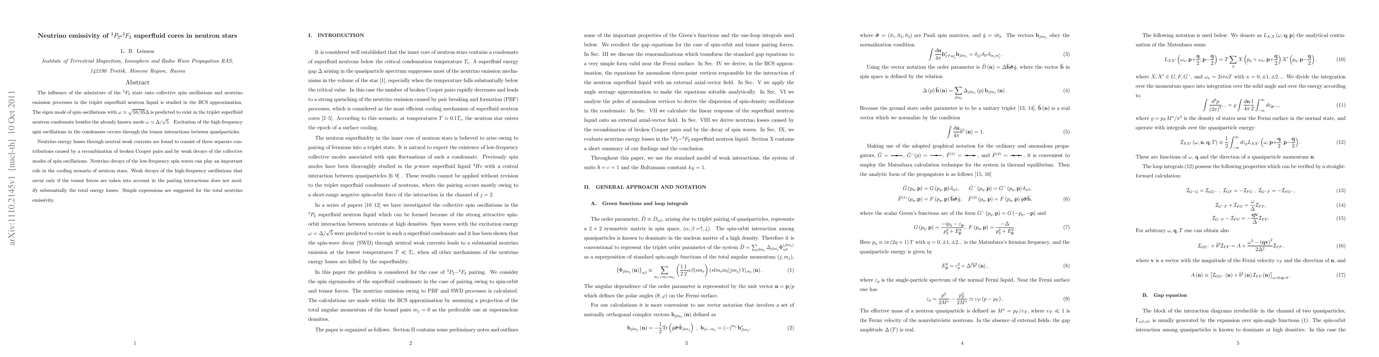 The influence of the admixture of the $^{3}F_{2}$ state onto collective spin oscillations and neutrino emission processes in the triplet superfluid neutron liquid is studied in the BCS approximation. The eigen mode of spin oscillations with $\omega\simeq\sqrt{58/35}\Delta$ is predicted to exist in the triplet superfluid neutron condensate besides the already known mode $\omega\simeq\Delta/\sqrt{5}$. Excitation of the high-frequency spin oscillations in the condensate occurs through the tensor interactions between quasiparticles. Neutrino energy losses through neutral weak currents are found to consist of three separate contributions caused by a recombination of broken Cooper pairs and by weak decays of the collective modes of spin oscillations. Neutrino decays of the low-frequency spin waves can play an important role in the cooling scenario of neutron stars. Weak decays of the high-frequency oscillations that occur only if the tensor forces are taken into account in the pairing interactions does not modify substantially the total energy losses. Simple expressions are suggested for the total neutrino emissivity.