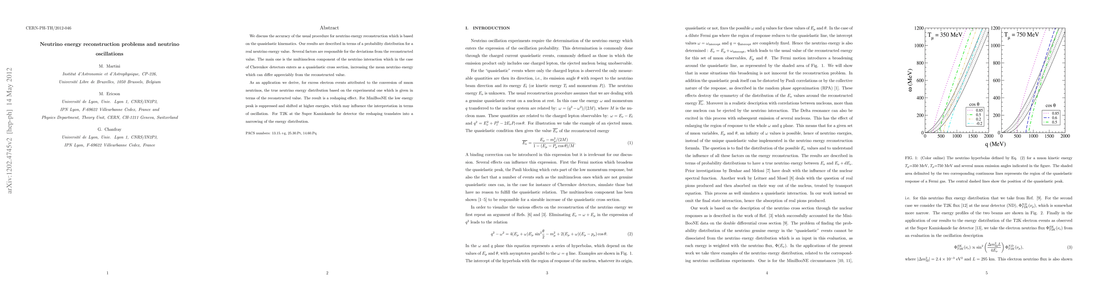 The paper examines neutrino energy reconstruction, highlighting that the traditional method based on quasielastic kinematics can be inaccurate due to factors like multinucleon interactions. This results in a reshaping of the true neutrino energy distribution, affecting interpretations in experiments like MiniBooNE and T2K at Super Kamiokande, potentially influencing oscillation interpretations.