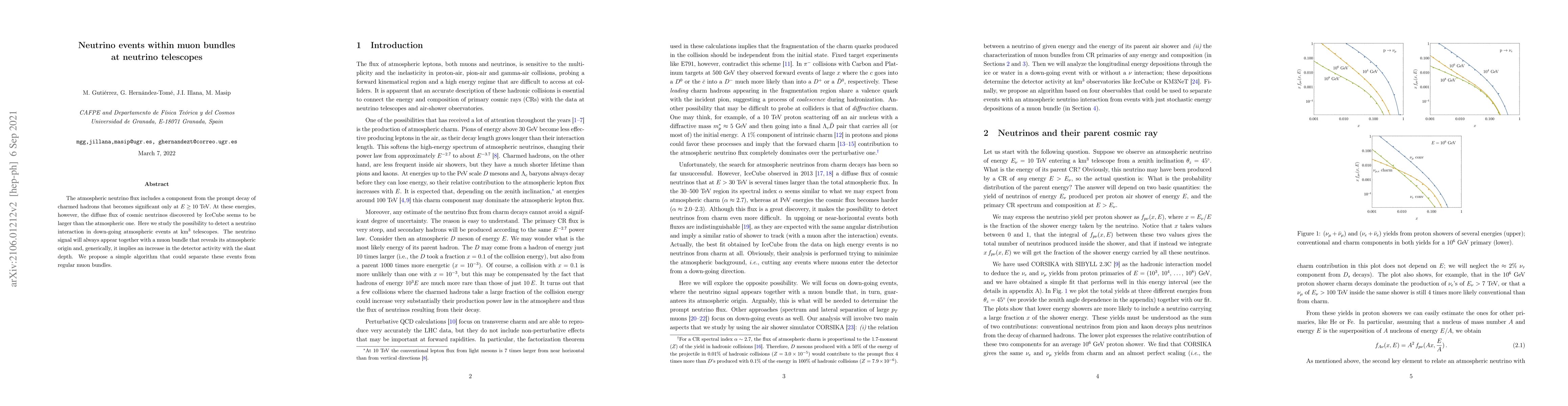 The atmospheric neutrino flux includes a component from the prompt decay of charmed hadrons that becomes significant only at $E\ge 10$ TeV. At these energies, however, the diffuse flux of cosmic neutrinos discovered by IceCube seems to be larger than the atmospheric one. Here we study the possibility to detect a neutrino interaction in down-going atmospheric events at km$^3$ telescopes. The neutrino signal will always appear together with a muon bundle that reveals its atmospheric origin and, generically, it implies an increase in the detector activity with the slant depth. We propose a simple algorithm that could separate these events from regular muon bundles.