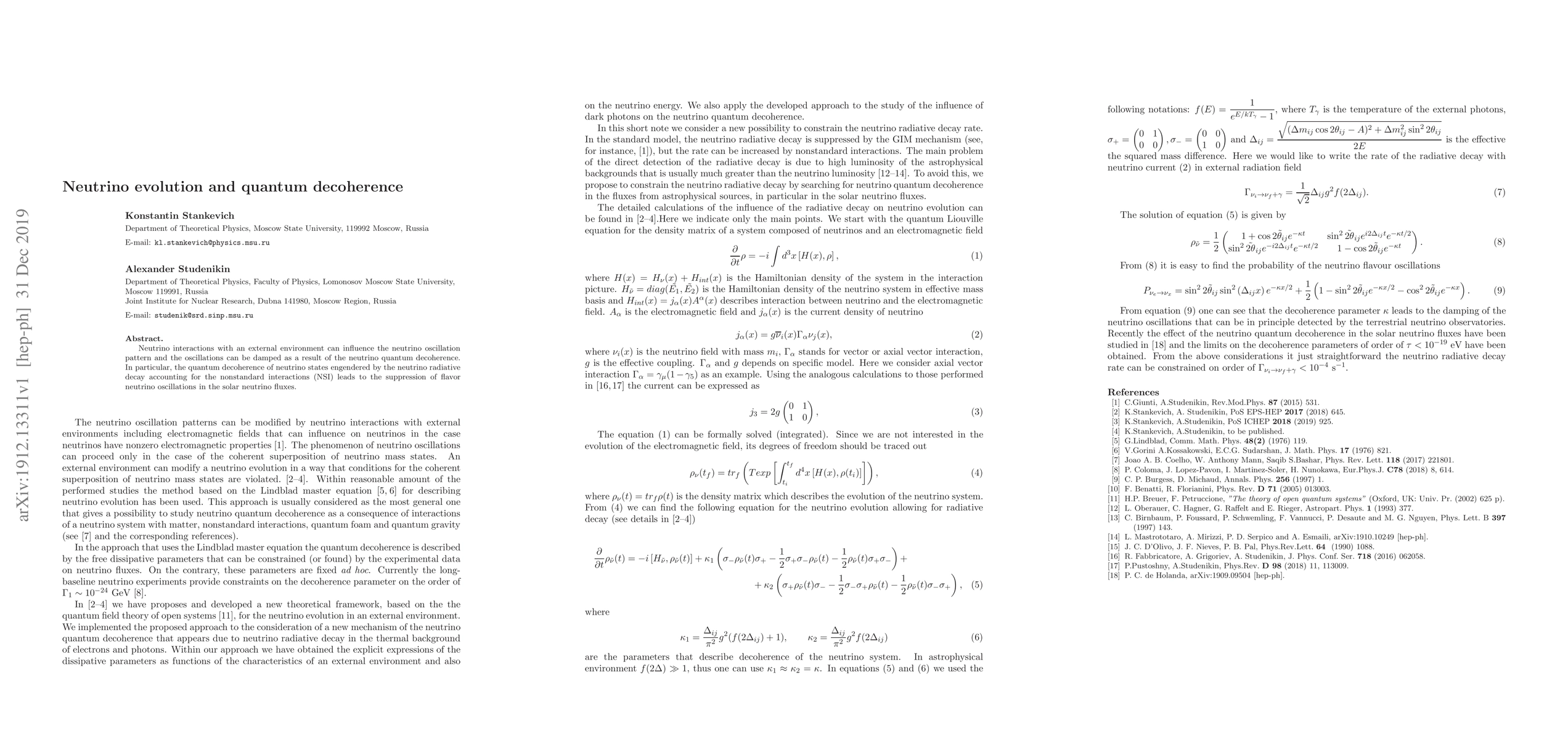 Summary: This paper investigates how neutrino interactions with external environments can lead to quantum decoherence, affecting the oscillation pattern and damping oscillations. It specifically examines the suppression of flavor neutrino oscillations in solar neutrino fluxes due to radiative decay and nonstandard interactions.
