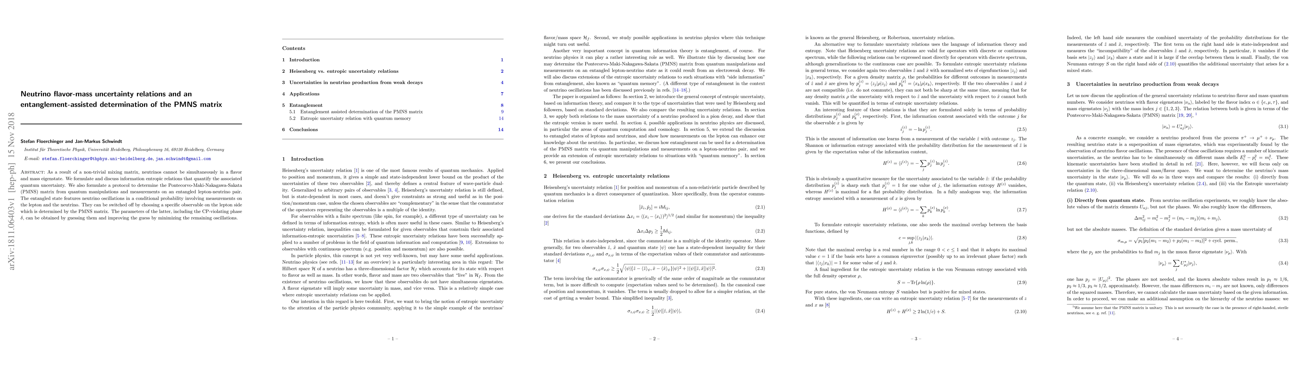 As a result of a non-trivial mixing matrix, neutrinos cannot be simultaneously in a flavor and mass eigenstate. We formulate and discuss information entropic relations that quantify the associated quantum uncertainty. We also formulate a protocol to determine the Pontecorvo-Maki-Nakagawa-Sakata (PMNS) matrix from quantum manipulations and measurements on an entangled lepton-neutrino pair. The entangled state features neutrino oscillations in a conditional probability involving measurements on the lepton and the neutrino. They can be switched off by choosing a specific observable on the lepton side which is determined by the PMNS matrix. The parameters of the latter, including the CP-violating phase $\delta$, can be obtained by guessing them and improving the guess by minimizing the remaining oscillations.