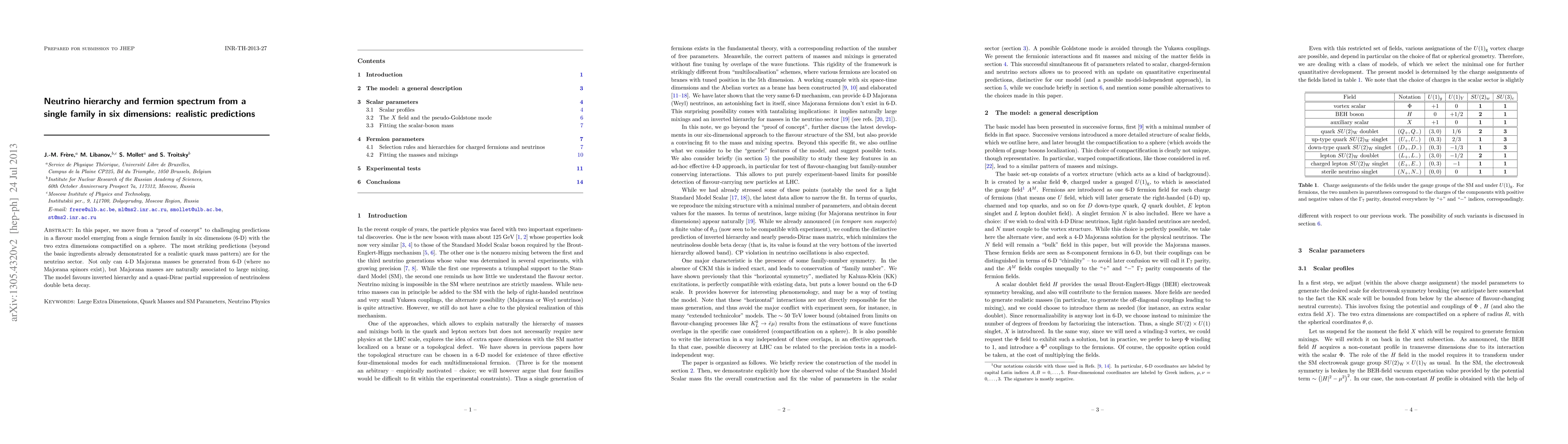 In this paper, we move from a "proof of concept" to challenging predictions in a flavour model emerging from a single fermion family in six dimensions (6-D) with the two extra dimensions compactified on a sphere. The most striking predictions (beyond the basic ingredients already demonstrated for a realistic quark mass pattern) are for the neutrino sector. Not only can 4-D Majorana masses be generated from 6-D (where no Majorana spinors exist), but Majorana masses are naturally associated to large mixing. The model favours inverted hierarchy and a quasi-Dirac partial suppression of neutrinoless double beta decay.