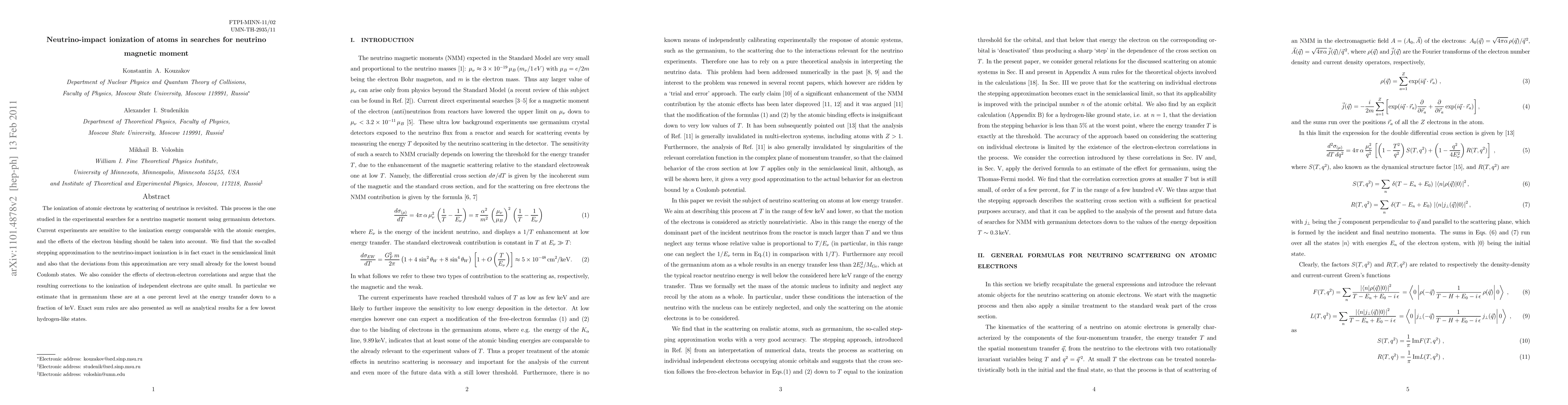 The ionization of atomic electrons by scattering of neutrinos is revisited. This process is the one studied in the experimental searches for a neutrino magnetic moment using germanium detectors. Current experiments are sensitive to the ionization energy comparable with the atomic energies, and the effects of the electron binding should be taken into account. We find that the so-called stepping approximation to the neutrino-impact ionization is in fact exact in the semiclassical limit and also that the deviations from this approximation are very small already for the lowest bound Coulomb states. We also consider the effects of electron-electron correlations and argue that the resulting corrections to the ionization of independent electrons are quite small. In particular we estimate that in germanium these are at a one percent level at the energy transfer down to a fraction of keV. Exact sum rules are also presented as well as analytical results for a few lowest hydrogen-like states.