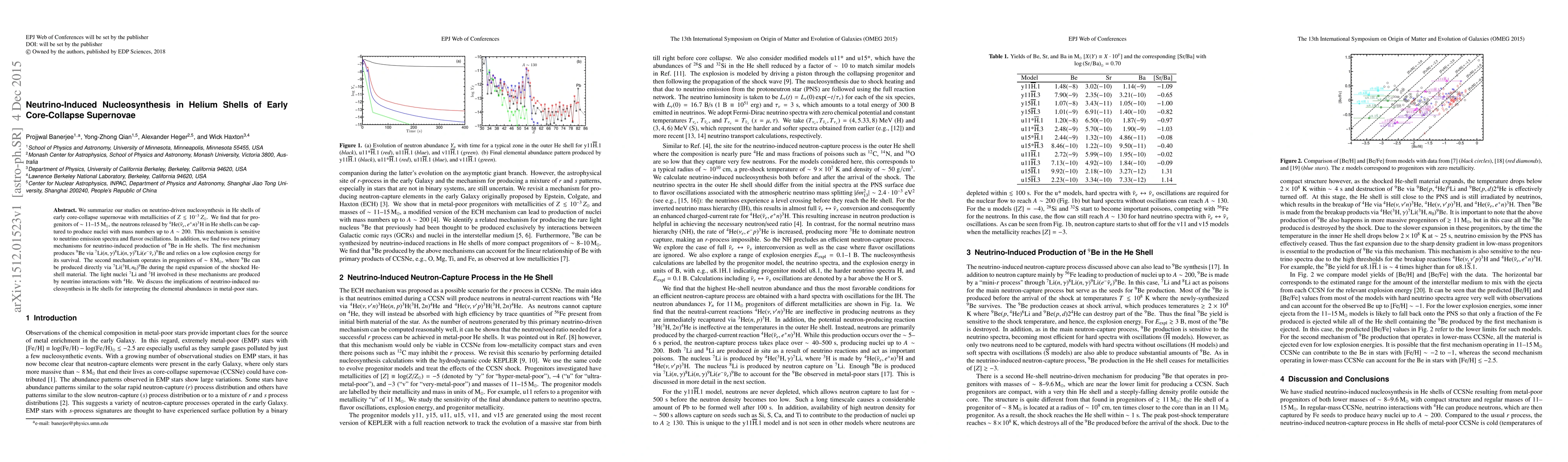 We summarize our studies on neutrino-driven nucleosynthesis in He shells of early core-collapse supernovae with metallicities of $Z\lesssim 10^{-3}\,Z_\odot$. We find that for progenitors of $\sim 11$--$15\,{\rm M}_\odot$, the neutrons released by $^4{\rm He}(\bar{\nu}_e,e^+n)^3{\rm H}$ in He shells can be captured to produce nuclei with mass numbers up to $A \sim 200$. This mechanism is sensitive to neutrino emission spectra and flavor oscillations. In addition, we find two new primary mechanisms for neutrino-induced production of $^{9}$Be in He shells. The first mechanism produces $^9$Be via $^7{\rm Li}(n,\gamma)^8{\rm Li}(n,\gamma)^9{\rm Li}(e^-\bar{\nu}_e)^9{\rm Be}$ and relies on a low explosion energy for its survival. The second mechanism operates in progenitors of $\sim 8\,{\rm M}_\odot$, where $^9$Be can be produced directly via $^7{\rm Li}(^3{\rm H},n_0)^9{\rm Be}$ during the rapid expansion of the shocked He-shell material. The light nuclei $^7$Li and $^3$H involved in these mechanisms are produced by neutrino interactions with $^4$He. We discuss the implications of neutrino-induced nucleosynthesis in He shells for interpreting the elemental abundances in metal-poor stars.