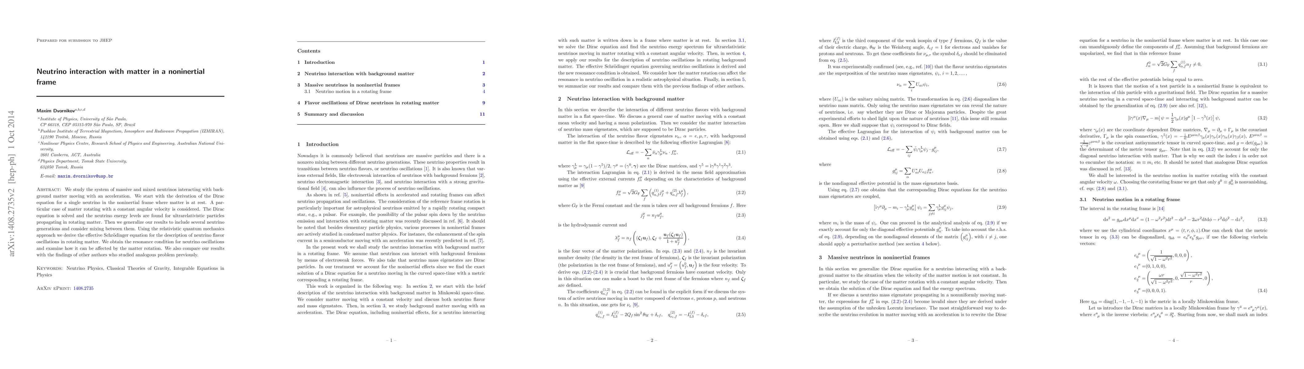 This research derives the Dirac equation for neutrinos in a noninertial frame with moving matter, solving it for ultrarelativistic particles in rotating matter. It generalizes findings for multiple neutrino generations and mixing, deriving an effective Schrödinger equation for neutrino flavor oscillations in rotating matter. The study also identifies a resonance condition for neutrino oscillations affected by matter rotation, comparing results with previous findings.