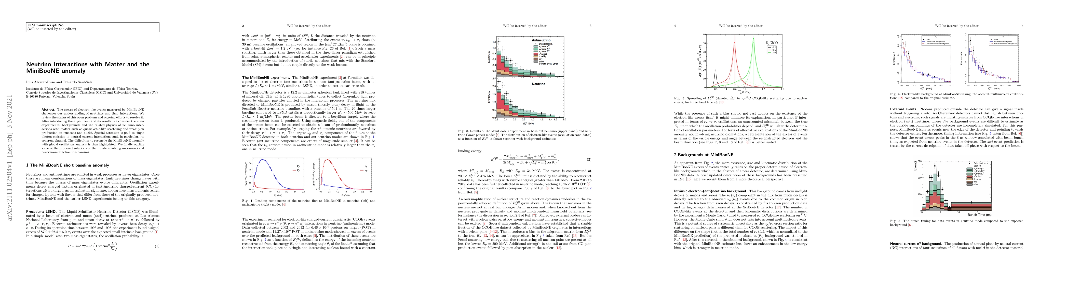 The MiniBooNE experiment reports an excess of electron-like events that challenges current neutrino oscillation models, prompting investigations into neutrino interactions with matter and potential background sources. Proposed solutions involve unconventional neutrino-interaction mechanisms to resolve the anomaly.