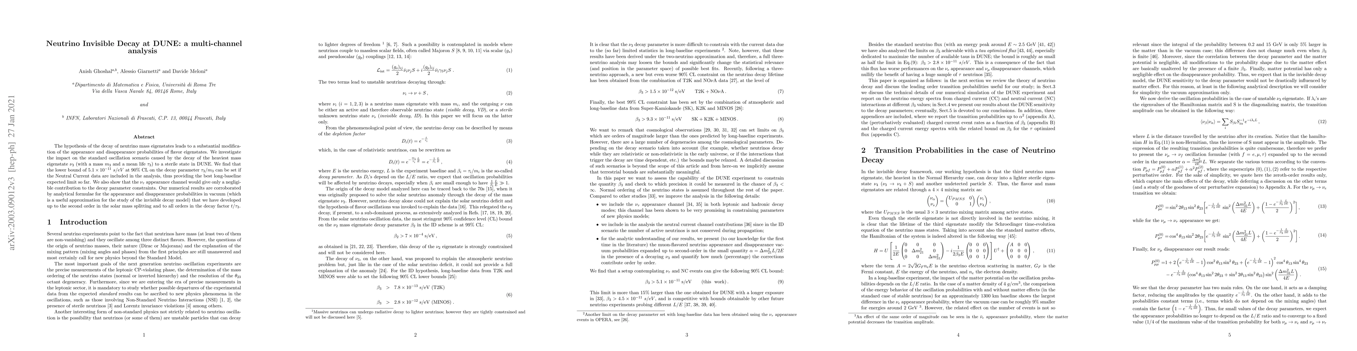 This paper investigates the impact of neutrino decay on oscillation probabilities in DUNE, finding a lower bound of $5.1 \times 10^{-11}~s/eV$ on the decay parameter $\tau_3/m_3$ when Neutral Current data is included, providing the best long-baseline limit to date. The $\nu_\tau$ appearance channel offers negligible constraints on this decay parameter.
