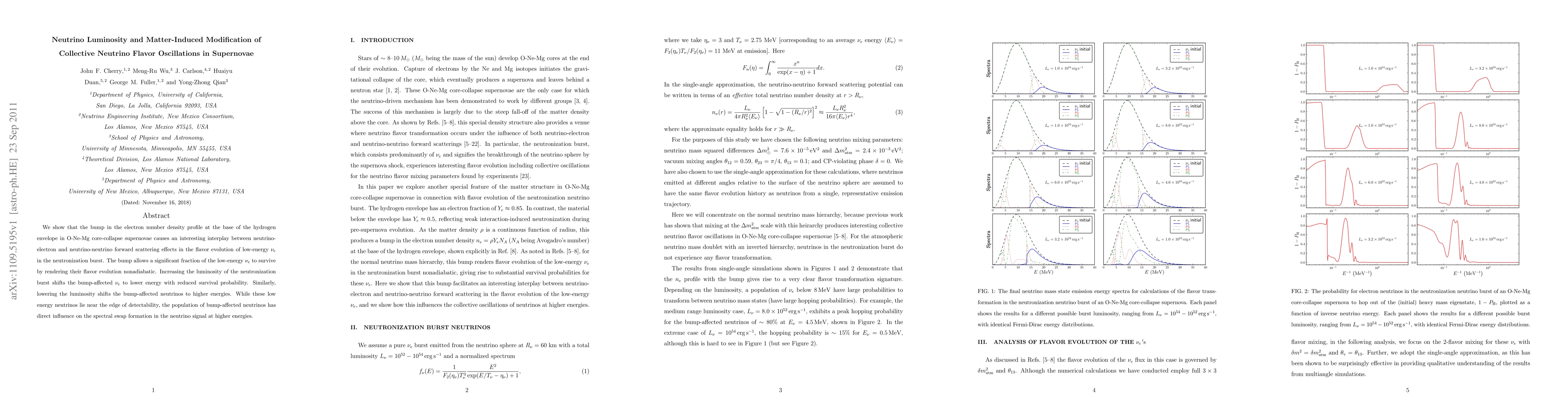 We show that the bump in the electron number density profile at the base of the hydrogen envelope in O-Ne-Mg core-collapse supernovae causes an interesting interplay between neutrino-electron and neutrino-neutrino forward scattering effects in the flavor evolution of low-energy nu_e in the neutronization burst. The bump allows a significant fraction of the low-energy nu_e to survive by rendering their flavor evolution nonadiabatic. Increasing the luminosity of the neutronization burst shifts the bump-affected nu_e to lower energy with reduced survival probability. Similarly, lowering the luminosity shifts the bump-affected neutrinos to higher energies. While these low energy neutrinos lie near the edge of detectability, the population of bump-affected neutrinos has direct influence on the spectral swap formation in the neutrino signal at higher energies.