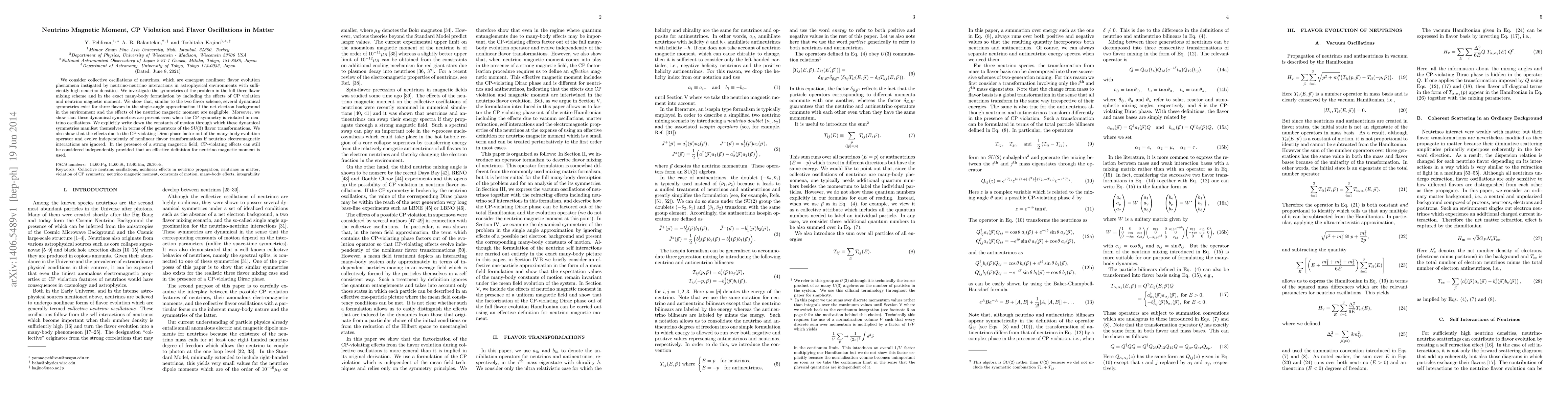 This paper explores collective neutrino oscillations in high-density astrophysical environments, focusing on the impact of CP violation and neutrino magnetic moment on flavor evolution. It reveals that dynamical symmetries persist in three-flavor neutrino mixing, even when CP violation is present, and identifies constants of motion that govern these symmetries.