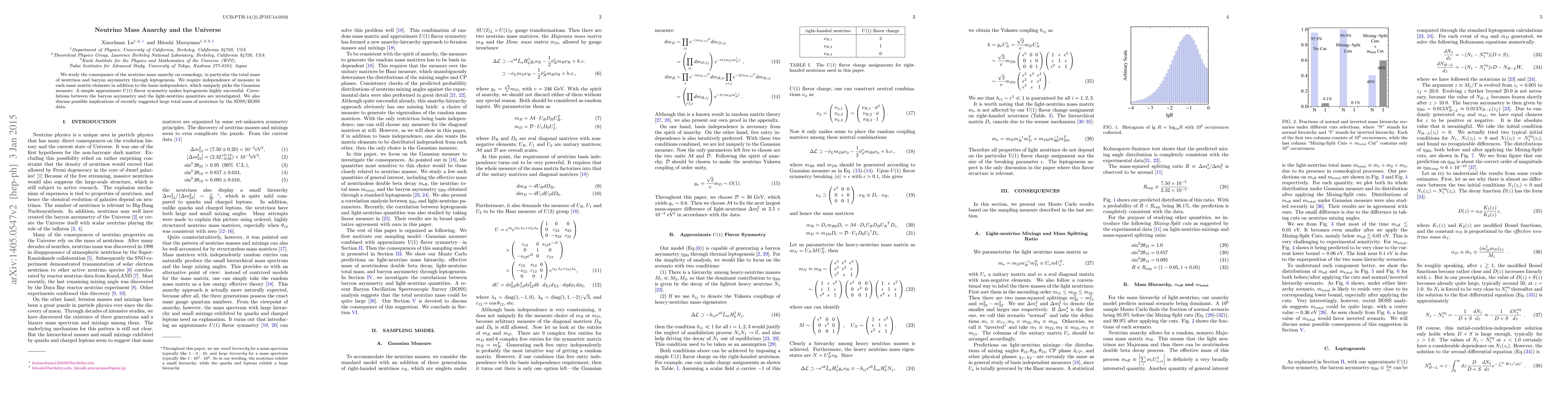 We study the consequence of the neutrino mass anarchy on cosmology, in particular the total mass of neutrinos and baryon asymmetry through leptogenesis. We require independence of measure in each mass matrix elements in addition to the basis independence, which uniquely picks the Gaussian measure. A simple approximate U(1) flavor symmetry makes leptogenesis highly successful. Correlations between the baryon asymmetry and the light-neutrino quantities are investigated. We also discuss possible implications of recently suggested large total mass of neutrinos by the SDSS/BOSS data.