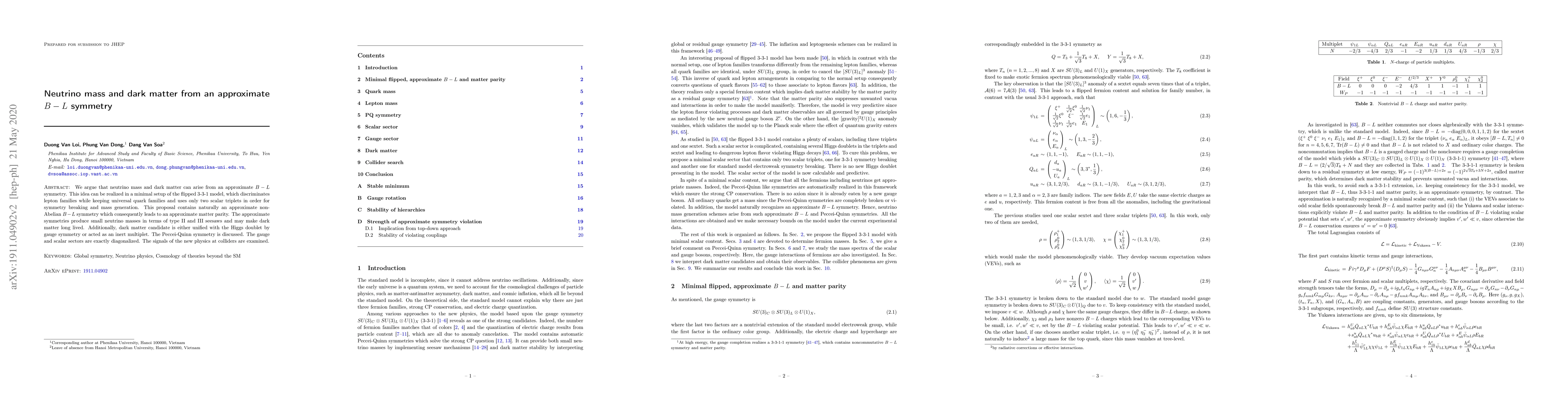 We argue that neutrino mass and dark matter can arise from an approximate $B-L$ symmetry. This idea can be realized in a minimal setup of the flipped 3-3-1 model, which discriminates lepton families while keeping universal quark families and uses only two scalar triplets in order for symmetry breaking and mass generation. This proposal contains naturally an approximate non-Abelian $B-L$ symmetry which consequently leads to an approximate matter parity. The approximate symmetries produce small neutrino masses in terms of type II and III seesaws and may make dark matter long lived. Additionally, dark matter candidate is either unified with the Higgs doublet by gauge symmetry or acted as an inert multiplet. The Peccei-Quinn symmetry is discussed. The gauge and scalar sectors are exactly diagonalized. The signals of the new physics at colliders are examined.